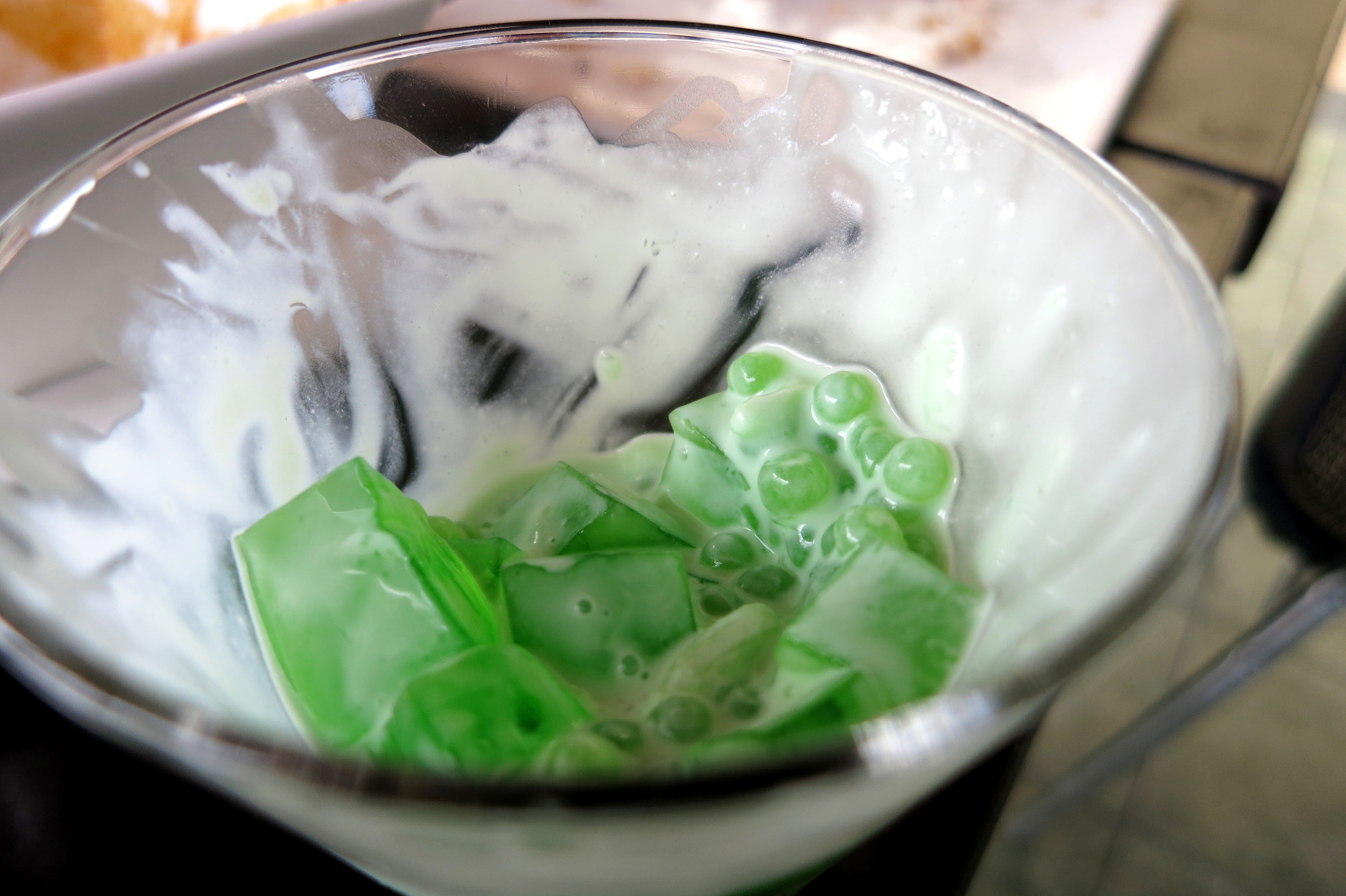 Ci-joint, le dessert local, proche du Halo Halo, autrement dit, du lait et de la gelée peu gouteuse uniquement … Mmmmh miam miam. Je finirai quand même par simple curiosité, ou par gourmandise comme vous voulez. A savoir que la raison de la couleur du Halo Halo vert émeraude a été décidée arbitrairement.
