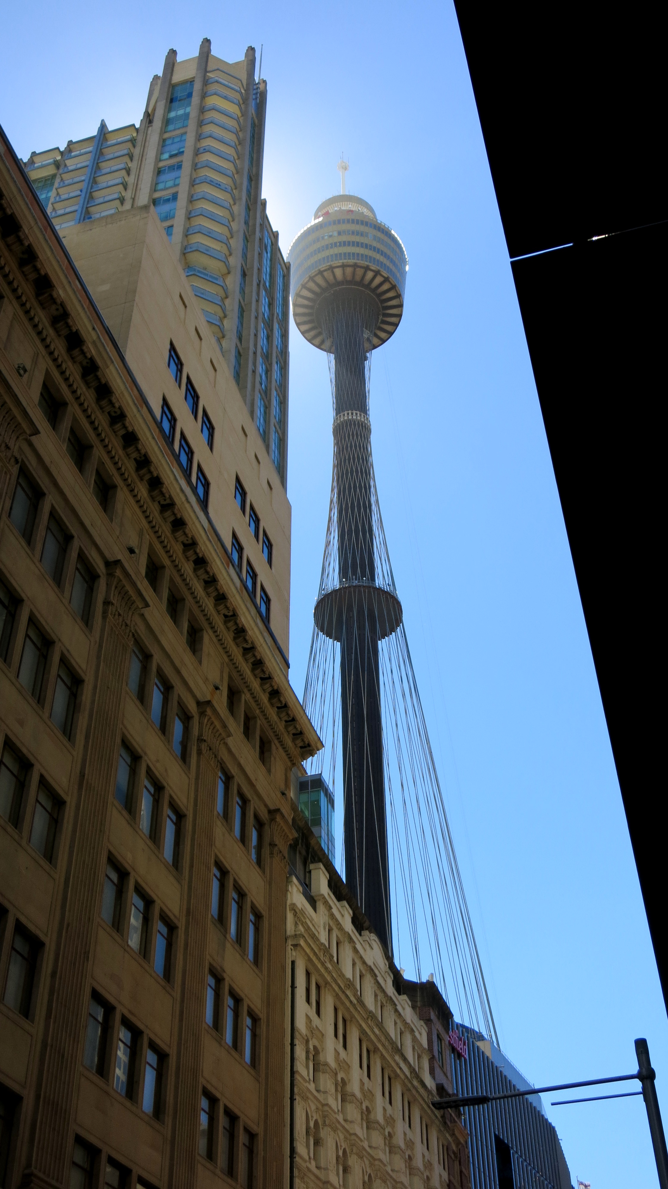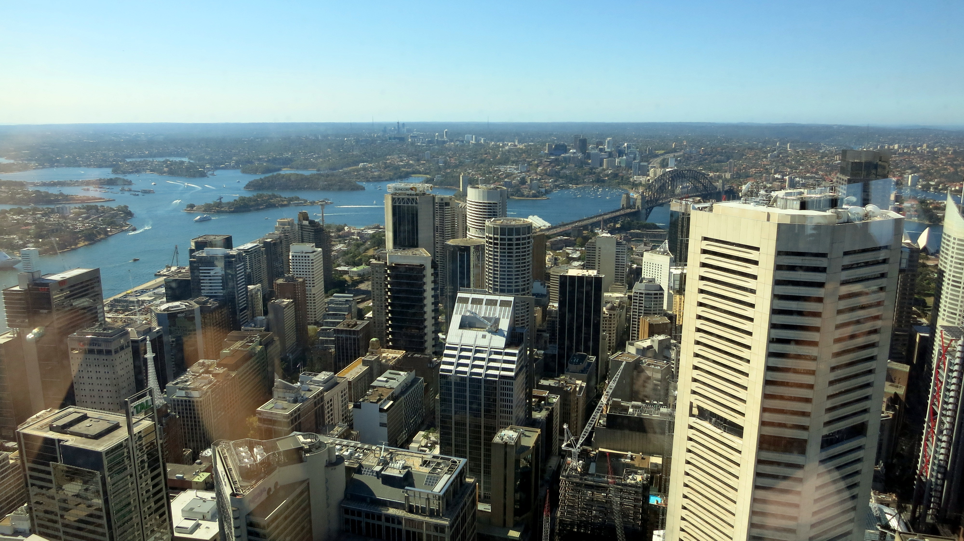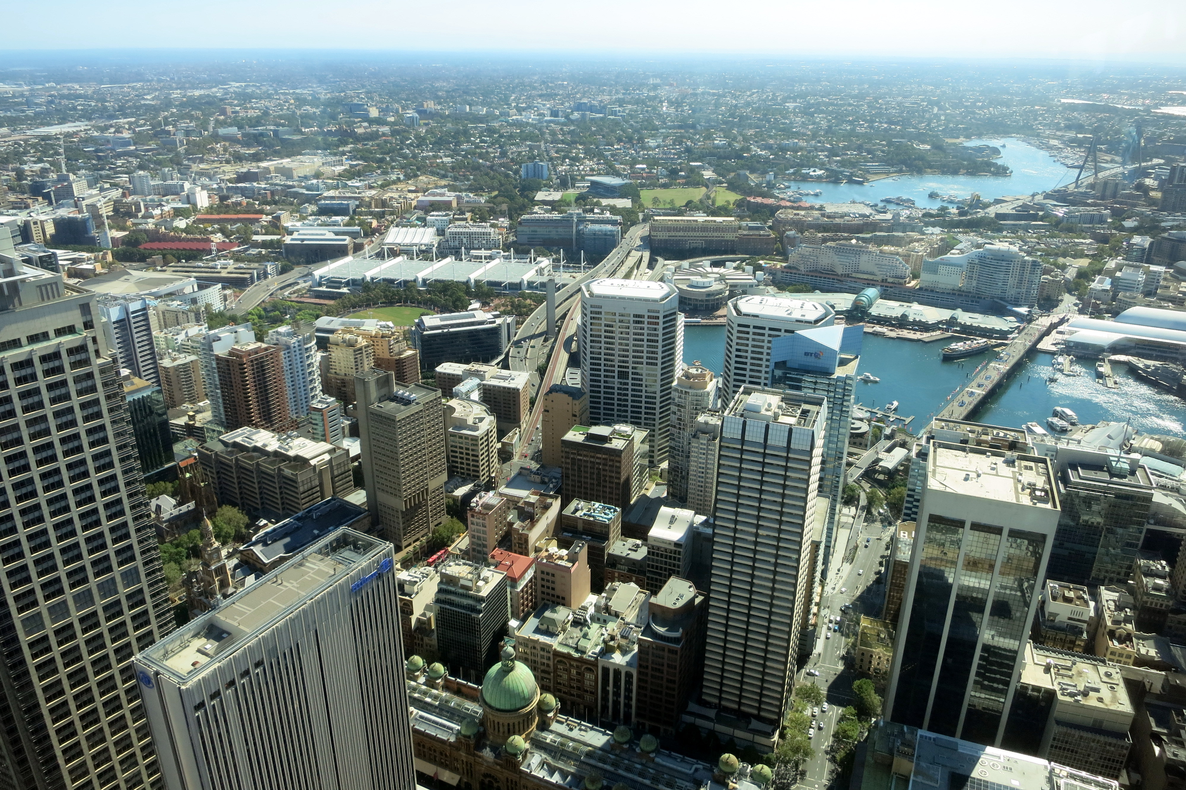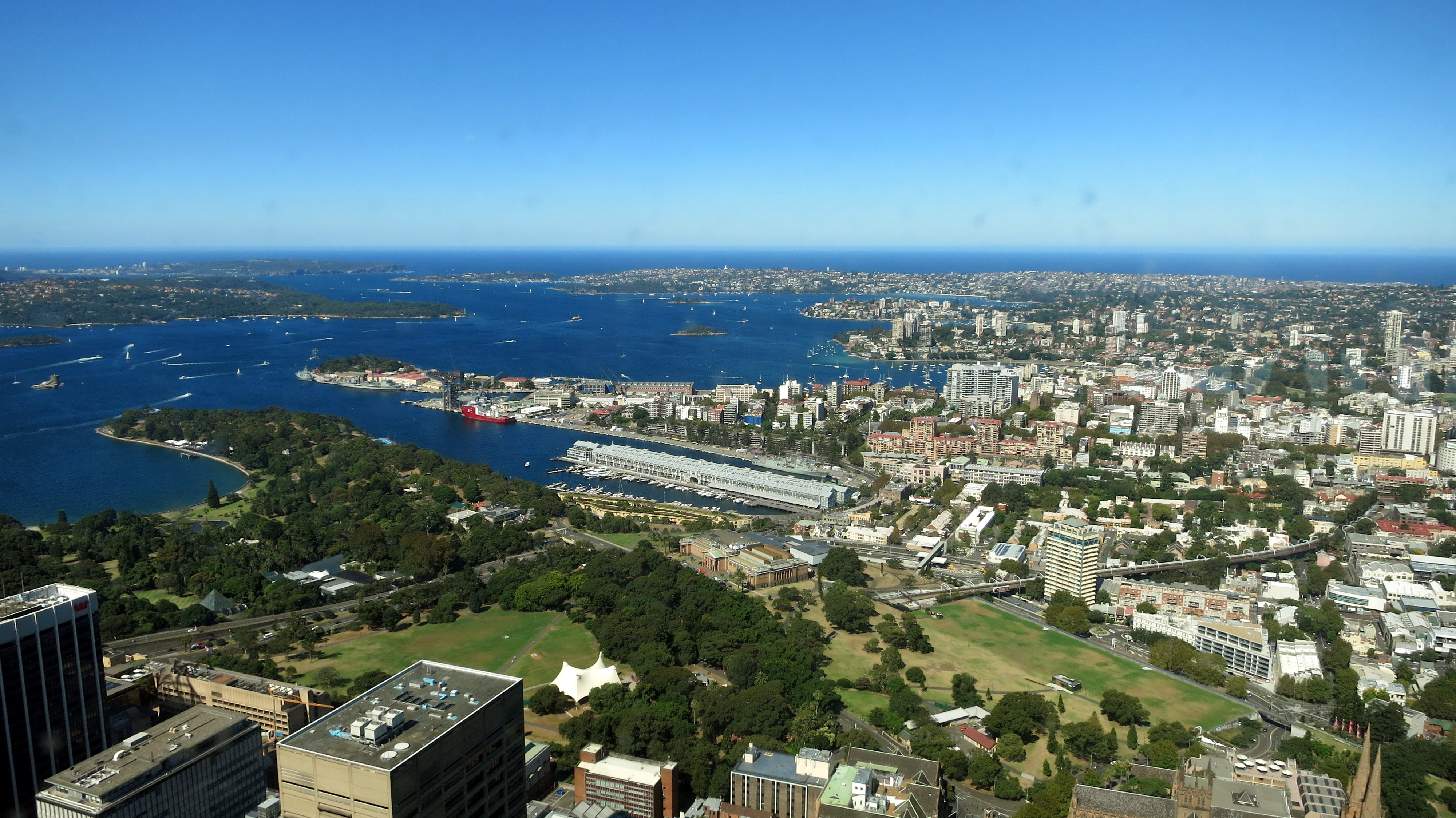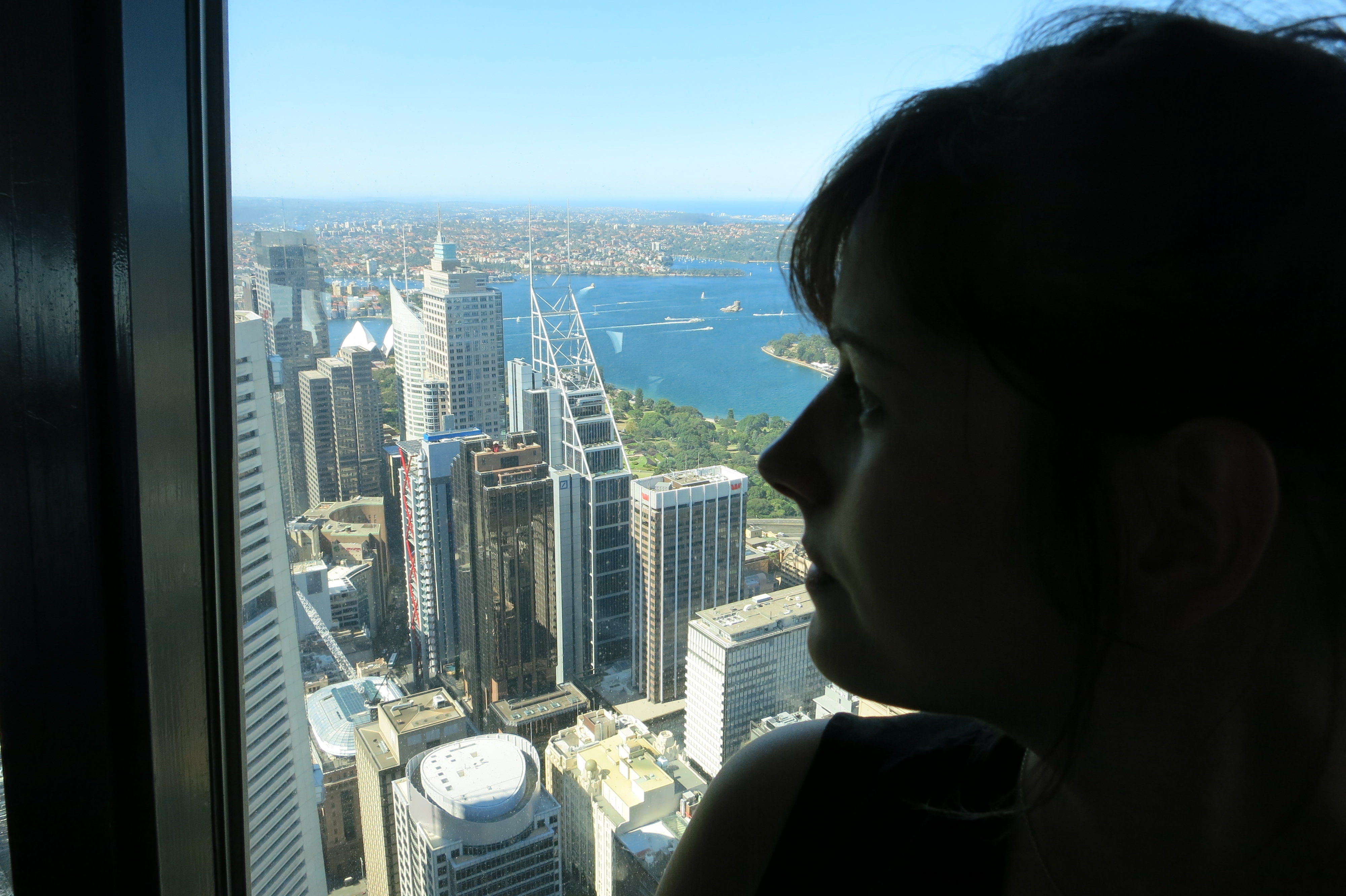 Assez parlé de Circular Quay : ce n’est pas la seule chose à voir à Sydney. En plus d’arpenter les rues, la priorité numéro 1 d’un touriste avisé est en général de trouver un point de vue qui permette d’admirer la ville et les environs. Pas très compliqué de mémoire ; allons faire un tour à la Sydney Tower Eye et montons tout en haut. Je suis certaine qu’en prenant de la hauteur, mon Josy va se sentir comme son ancien chez lui à Hong Kong tandis que je m’apprête à re-savourer cette expérience. Bingo, pas de queue, pas d’attente, un petit film sur la ville pour tenter de justifier les 25 euros qu’on nous a fait payer pour monter, et puis le plaisir d’apercevoir les Blue Mountains au loin avec ce ciel si bien dégagé. Vue à 360° qui confirme ce que je pensais : la plus belle baie du monde mérite bien son nom. J’en étais déjà persuadée, j’en suis maintenant convaincue. Je vous laisse apprécier la vue pour vous en faire une idée.