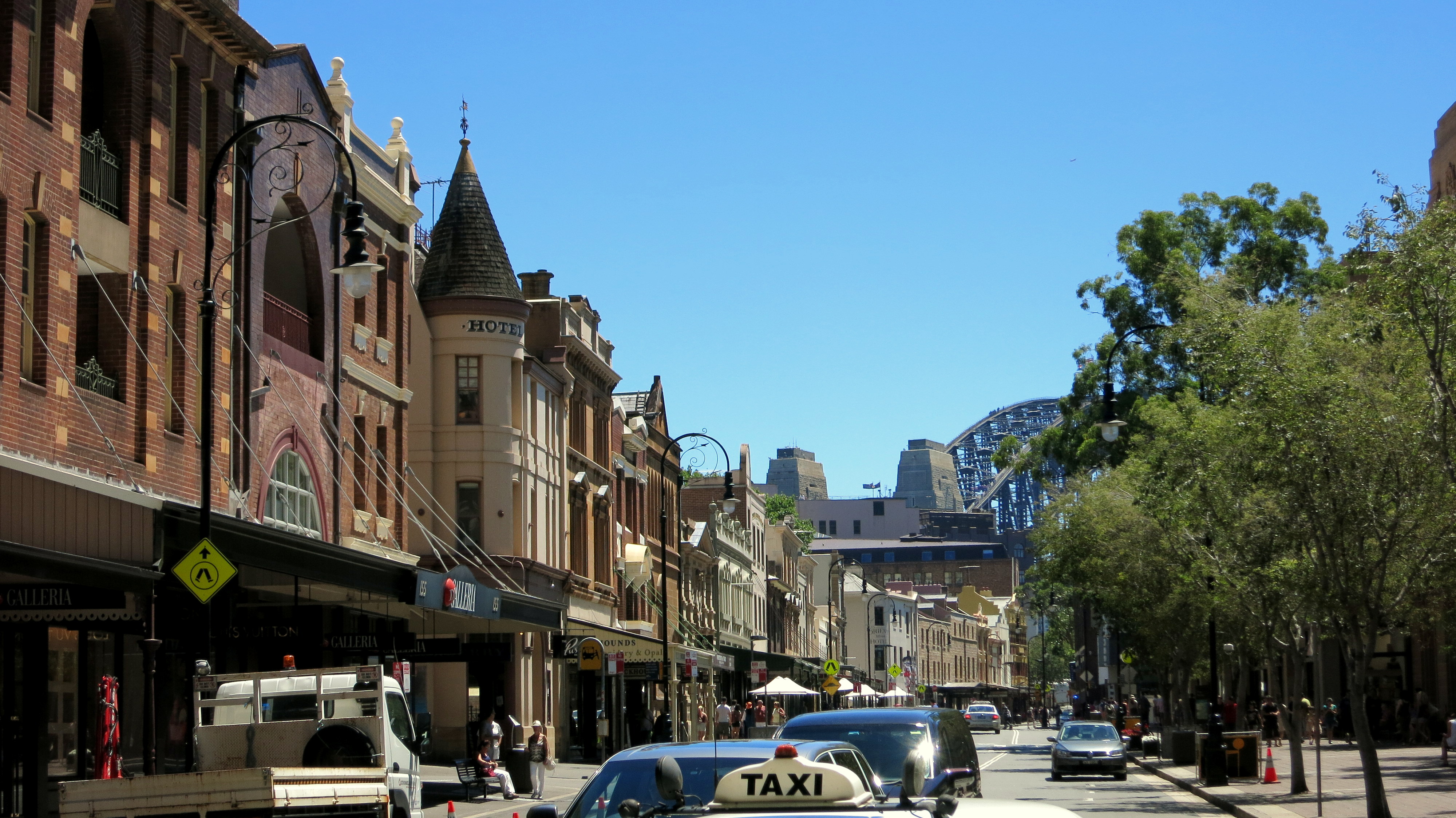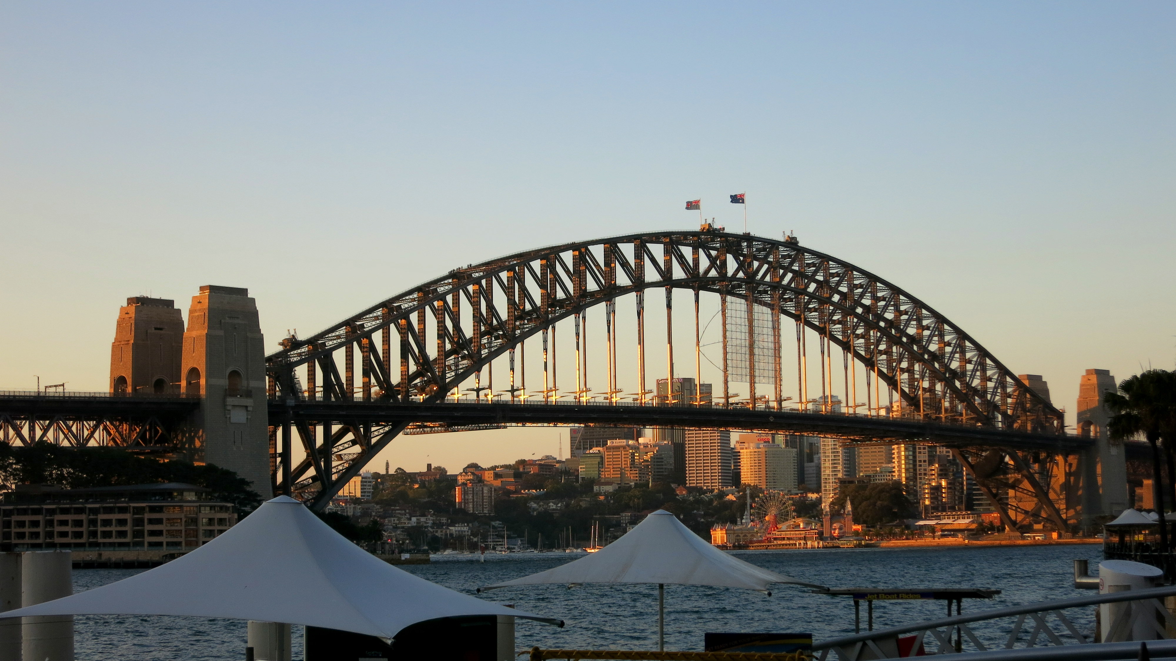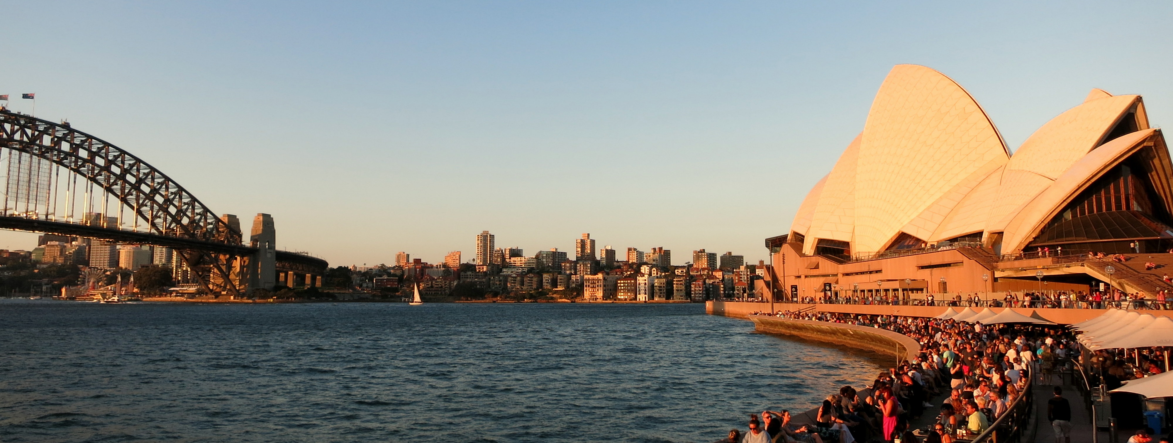Direction donc en priorité l’Opéra le plus célèbre du monde, celui qui surplombe la baie et qui fait concurrence au Harbour Bridge. Une fois que l’on rejoint Circular Quay, il semble que l’un de va pas sans l’autre : sur les photos, on se plait à prendre les deux, à jouer avec les ombres et les silhouettes. Notre premier aperçu après avoir descendu la rue principale de la City, alias George Street -3km de long-, sera le quartier des Rocks qui mène tout droit au Harbour Bridge. Du charme, du charme, encore du charme, et un aménagement exceptionnel. On sent que le tout a été pensé et dessiné pour les touristes mais la vue est indéniablement impressionnante tandis que l’ambiance est on ne peut plus typique avec les cafés-restaurants. En longeant Circular Quay, je me remémore les images et suis ravie de voir qu’aujourd’hui, j’en suis tout autant voire plus émerveillée.