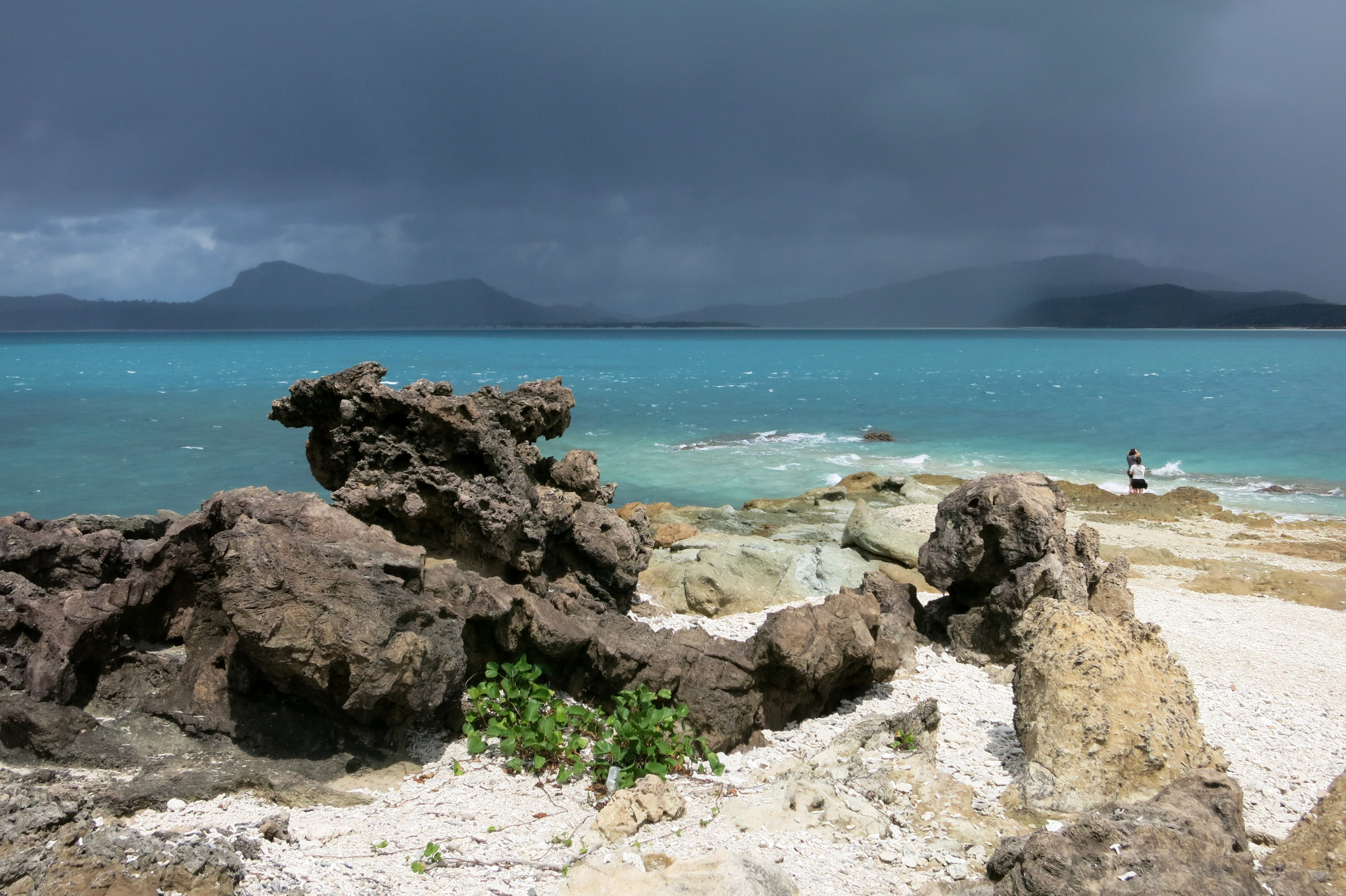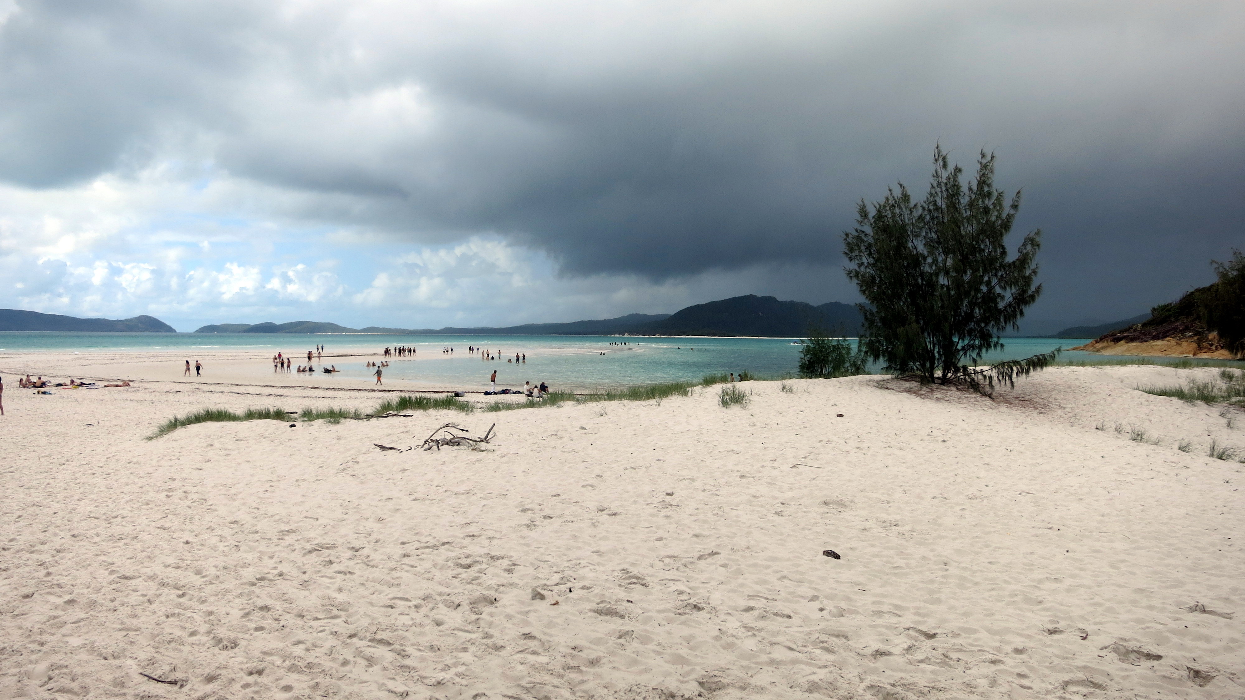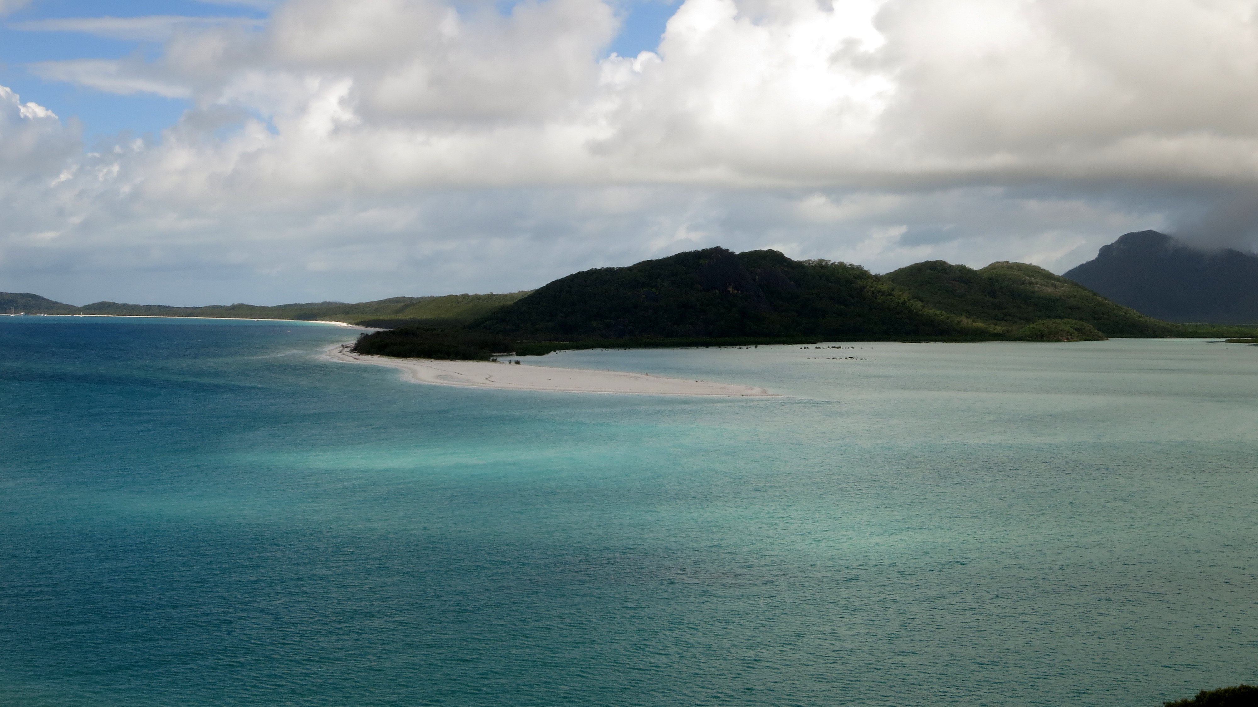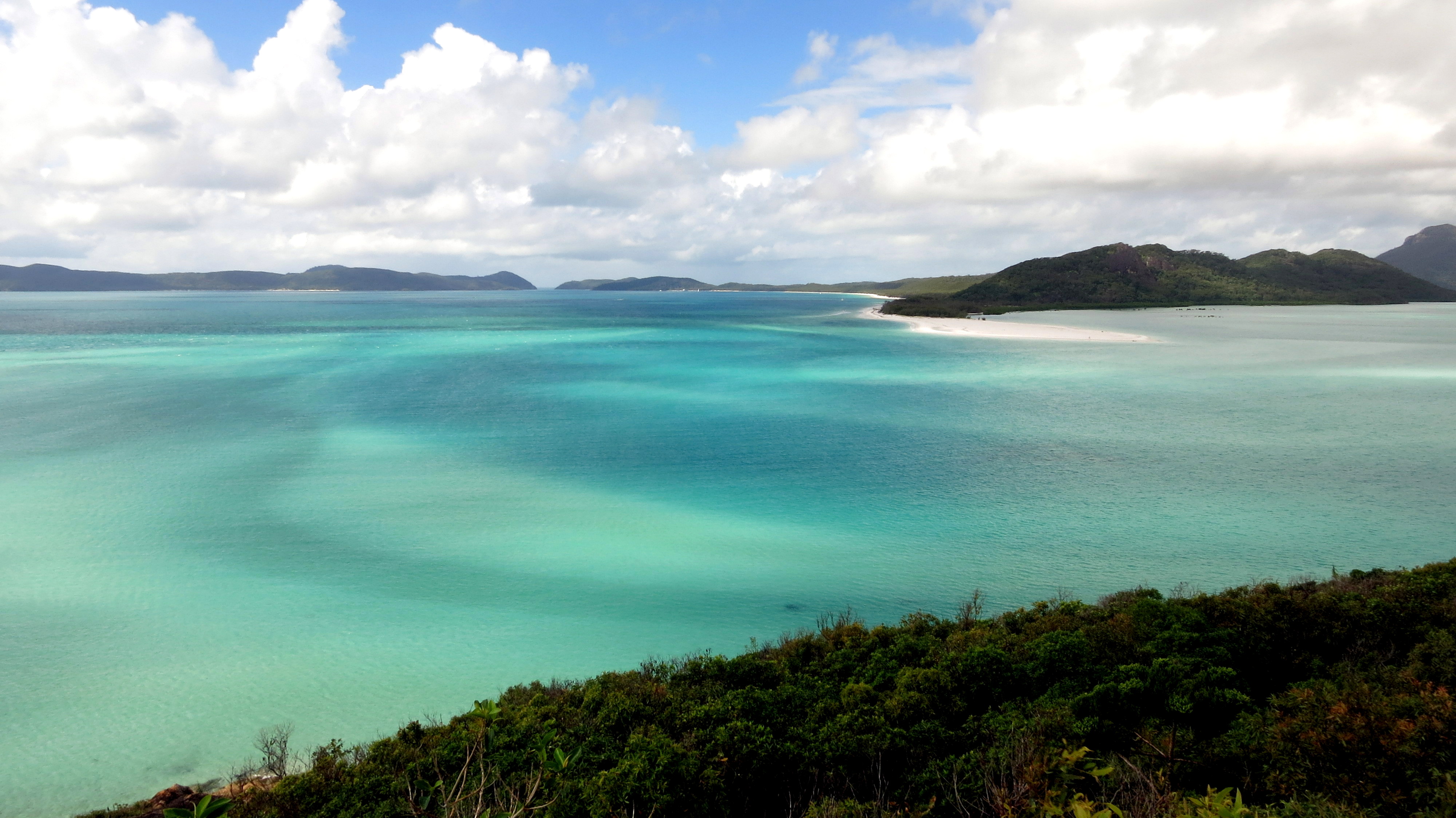 Le point de vue sur Whitehaven beach est une étape incontournable. Un must-see qu’aucun touriste ne peut se permettre de manquer, ou bien celui-ci n’a décidément pas saisi le véritable intérêt du lieu. Entre deux cailloux évités, je fais copain-copine avec le guide et tente de me rassurer sur nos chances de voir notre journée définitivement gâchée : oui oui, il semblerait que nous soyons tombées sur une des seules 65 journées de l’année où le ciel ne nous fera pas de cadeau. Fort bien …passons notre chemin avant que se lise sur mon visage tristesse, détresse et que sais-je. Là-haut, les nuages bas assombrissent la scène. Je ne sais pas pourquoi, cela dit, mais j’aurai foi en mon karma. Guide, veux-tu bien patienter quelques minutes supplémentaires s’il te plait, je suis certaine que tout cela n’est qu’une immense supercherie ; que le soleil va faire son apparition et ainsi dévoiler cette étendue de sable que nous sommes censées admirer. Well, je vous laisse juger par vous-même l’évolution minute par minute… ou en 360°