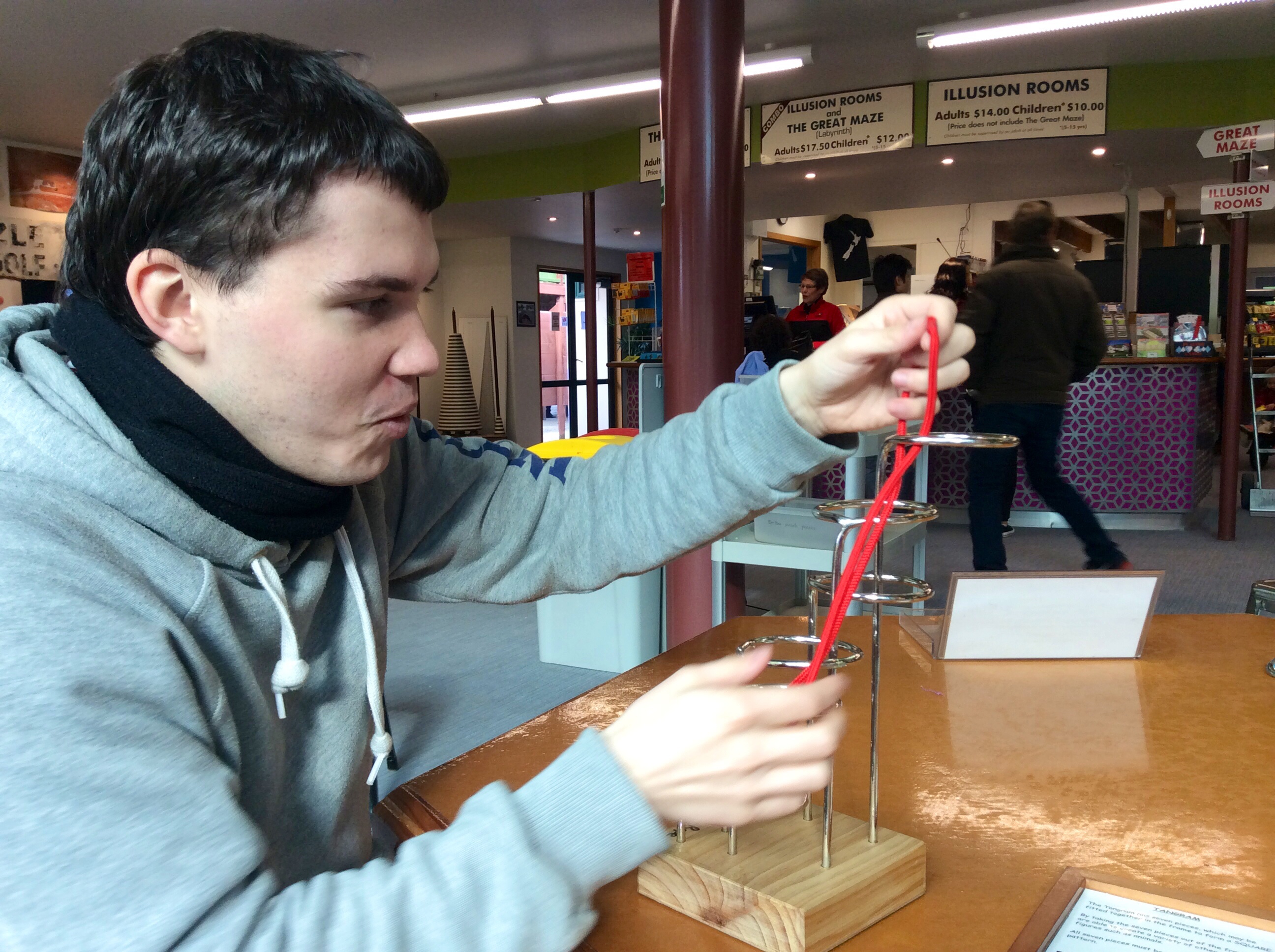 Sur le chemin, on passe par Wanaka et son célèbre lac, et faisons un petit tour au Puzzling World, dont nous ne paierons pas l’entrée du fait de radinerie soudaine, mais dont nous profiterons du hall d’accueil pour tenter de résoudre casse-têtes et énigmes, comme des gamins. JB aurait pu y rester des heures, mais le temps est compté. Cuisant échec que de devoir s’avouer vaincu face à des cordes impossibles à démêler 😉