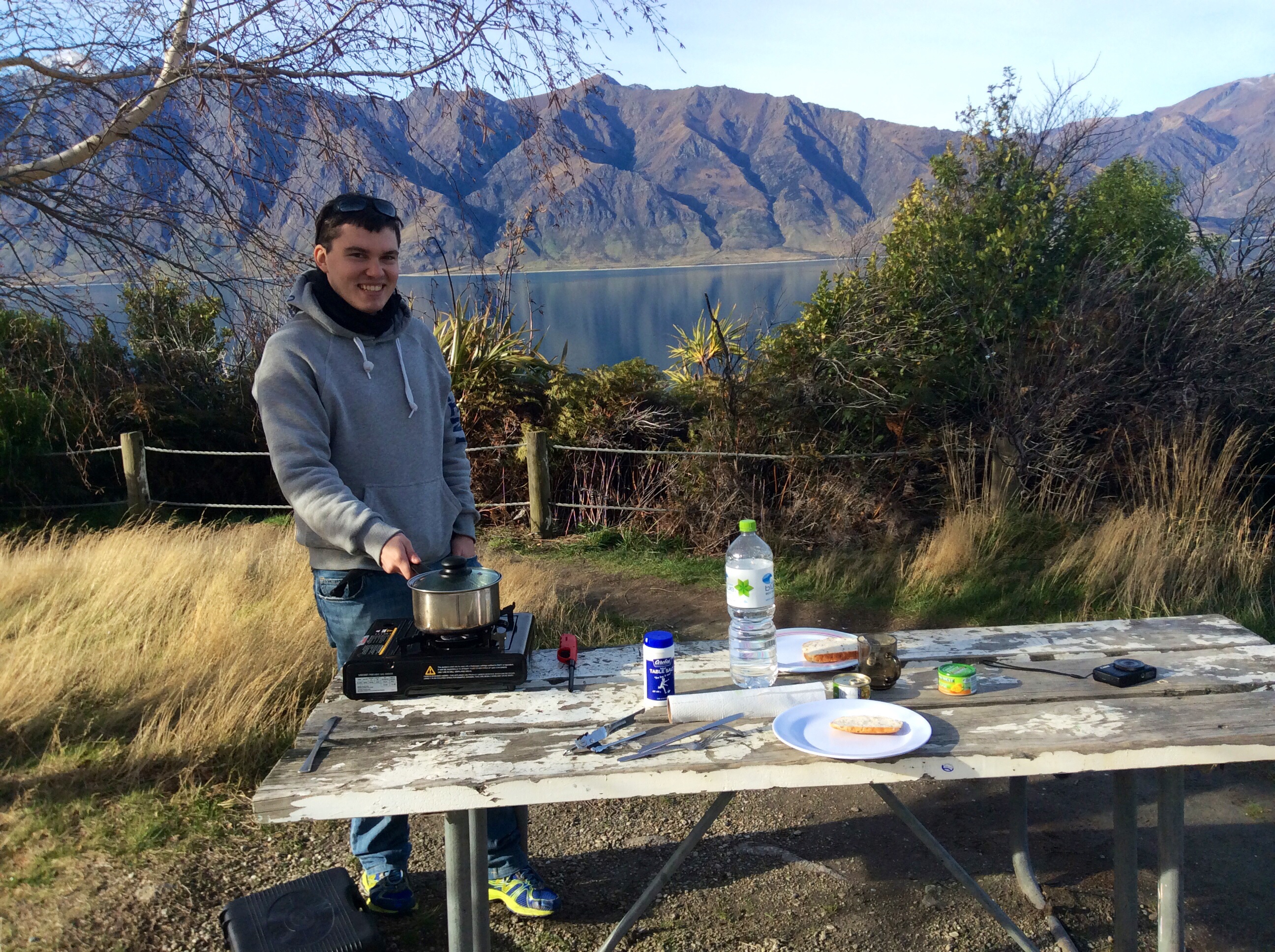 En parlant de pâtes, c’est ce midi là qu’on a sans doute trouvé le coin le plus idéal pour manger et se poser. Croyez-le ou non, mais cette cuisson de haricots verts, au bord d’une route surplombant un énième lac impressionnant, restera dans les annales et figurera sans doute parmi les plus beaux moments jamais inscrits de ce voyage. Du haut de notre promontoire, un silence imprenable et réconfortant. Pas de bruit de moteur (saut pour les asiatiques passés par là et qui n’ont pas eu la décence de le couper …et à qui j’ai littéralement eu envie de faire la morale, si ce n’est passer à l’étape supérieure en commettant un meurtre), pas de pollution, pas de nuisibles, rien. Que de la nature, un véritable moment pur. La cerise sur le gâteau, avec le moment venu de déguster l’un de nos chocolats achetés dans la matinée.
