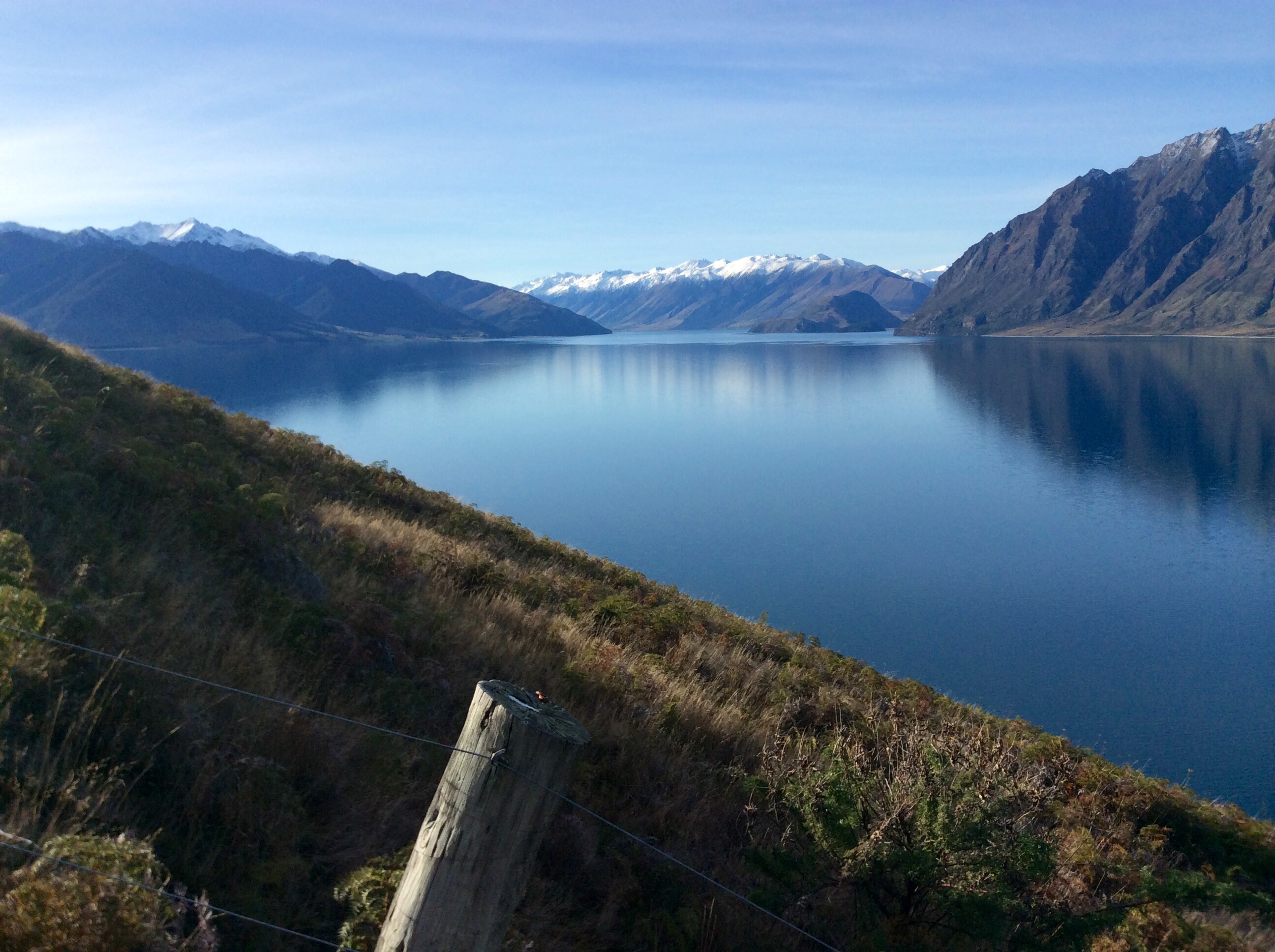 On rejoindra les glaciers et la « West Coast » tard le soir – sous entendu 18h quand il fait déjà nuit noire – mais au passage seront immortalisés des paysages d’une beauté sans faille. Nous avons changé de région, et nous le sentons à la vue de la végétation, des falaises, des étendues de plaines et de tous ces estuaires. Au revoir la montagne et bonjour les glaciers.