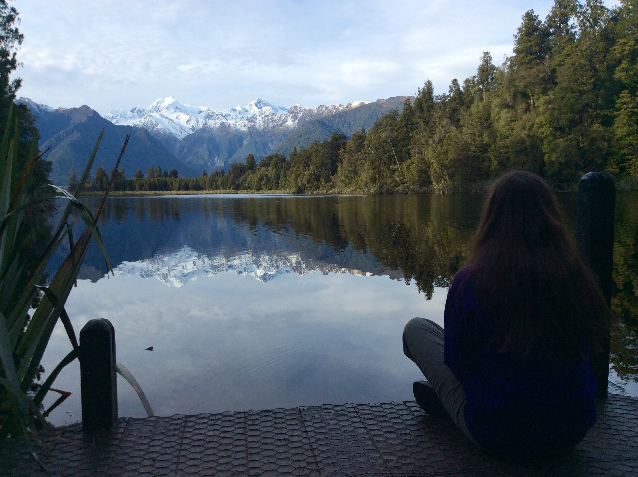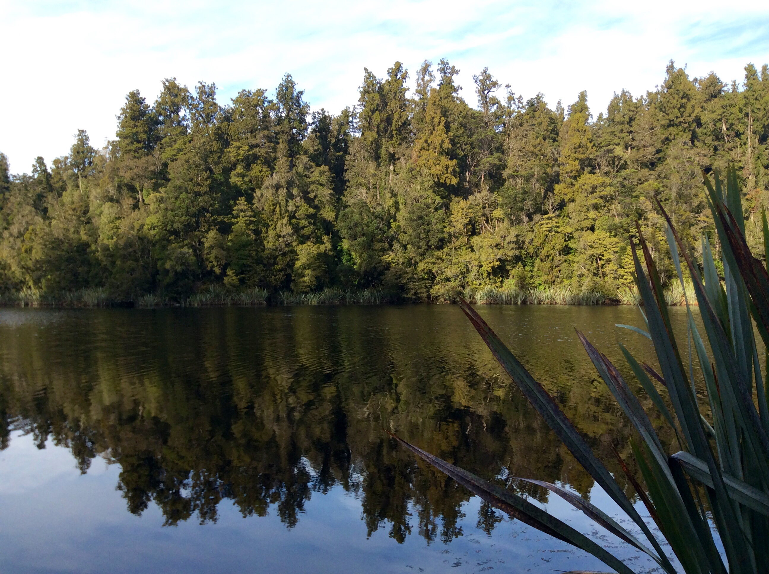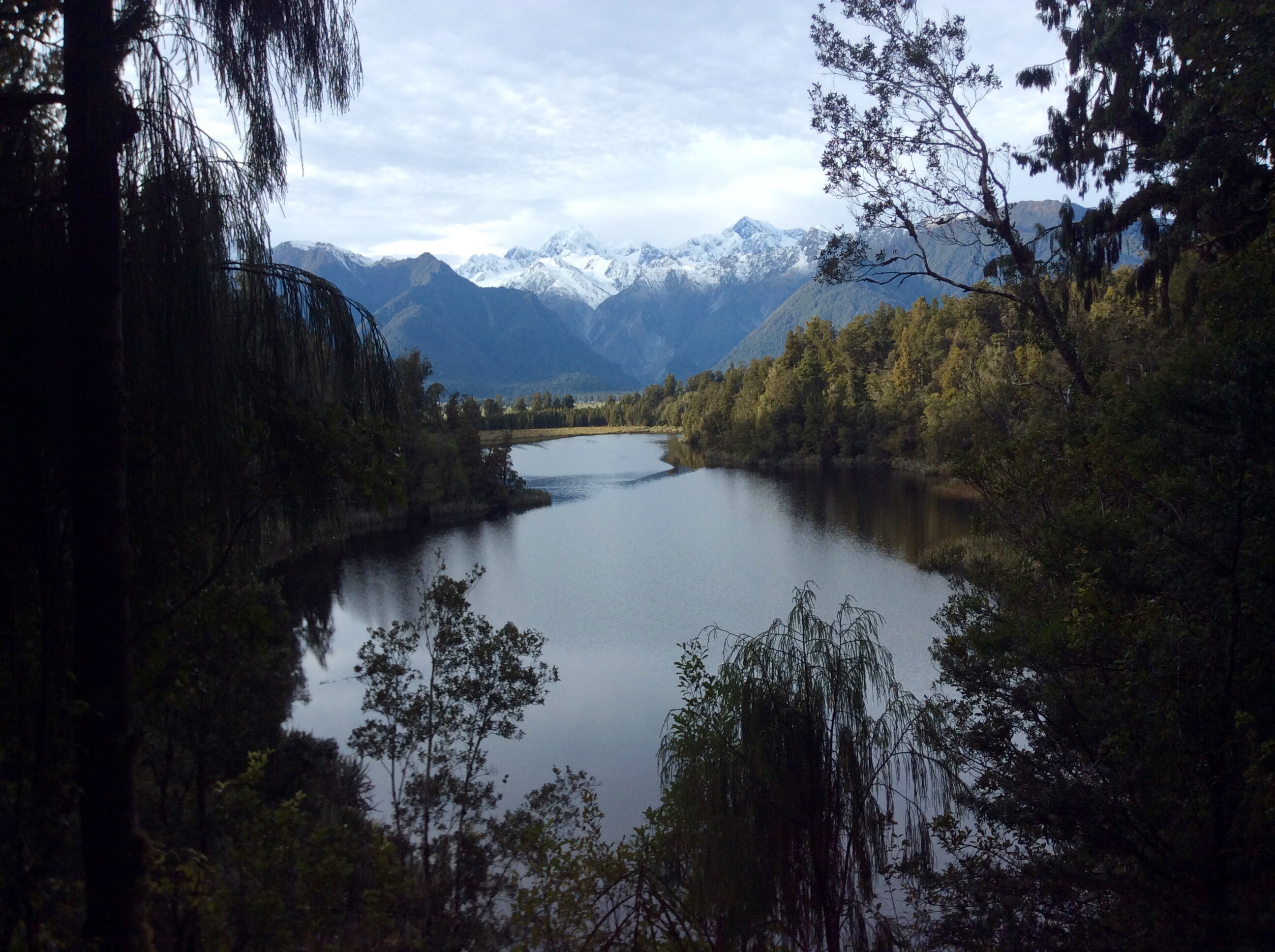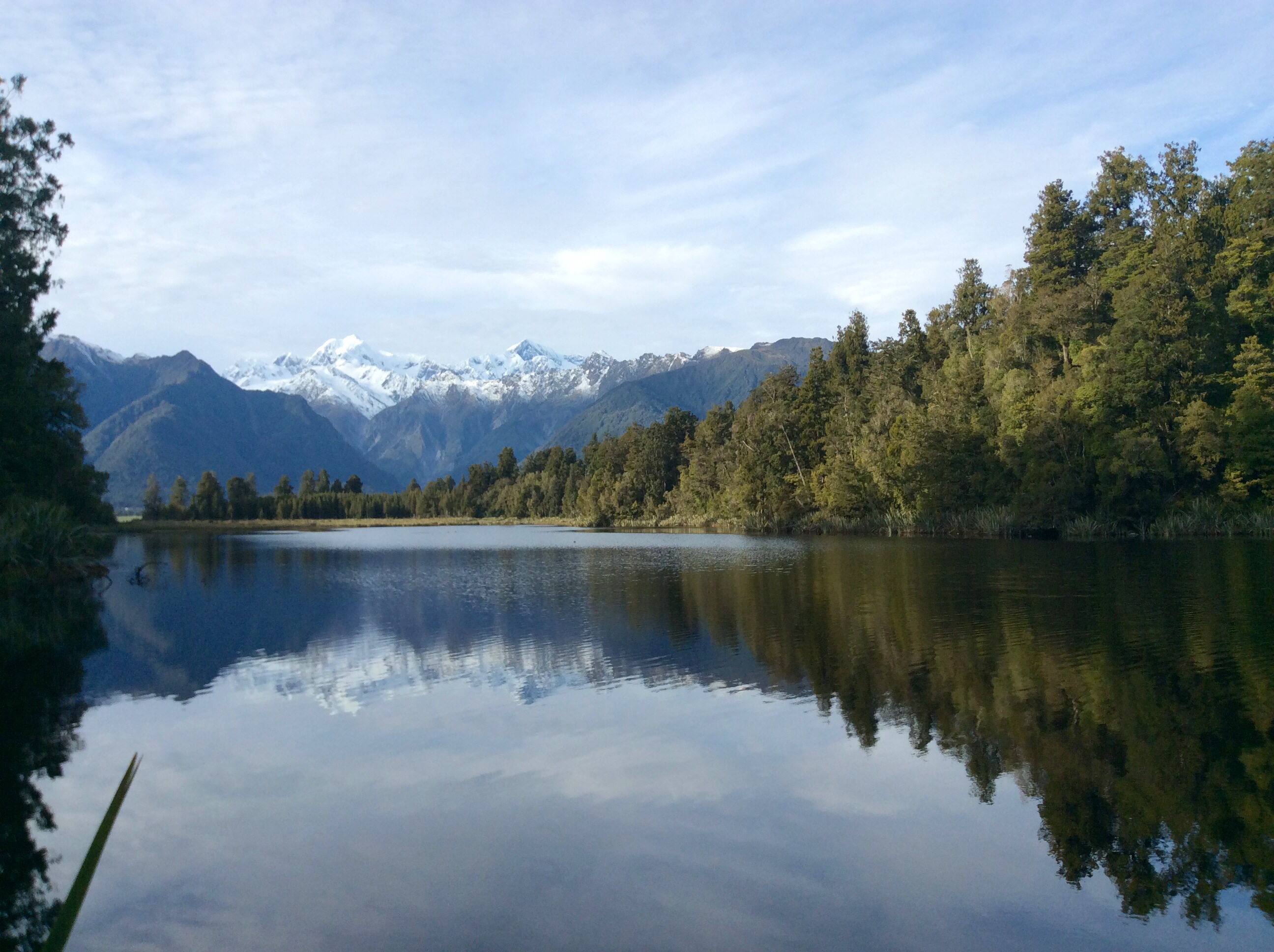 Journée marathon dans tous les sens du terme : nous n’avons pas chômé avec toutes ces étapes, et avons surtout effectué notre exercice sportif du mois. Forts désireux de profiter d’une petite marche près du lac carte postale de Nouvelle-Zélande, à savoir le lac Matheson, nous n’aurions cela dit pas deviné qu’il nous faudrait plus d’une heure pour en faire le tour. Loin de nous déplaire, on profite là encore des rayons de soleil qui percent et donnent aux arbres ce vert jaunâtre si réconfortant. Les couleurs sont chaudes et les dégradés présents : entre celui du ciel, des montagnes à l’horizon, de la végétation et de l’eau qui permet toutes sortes de reflets, on en aura pris plein les yeux.
