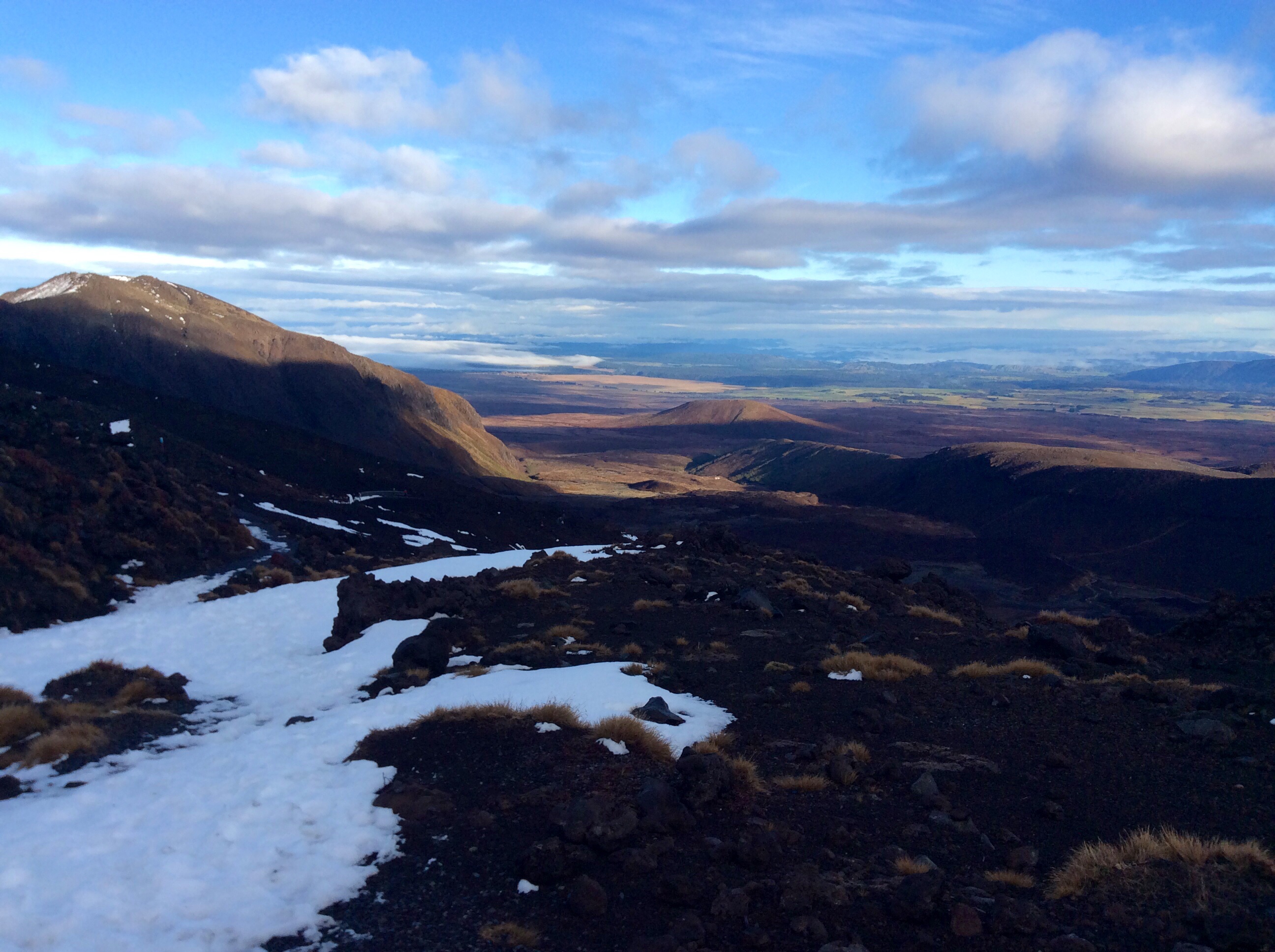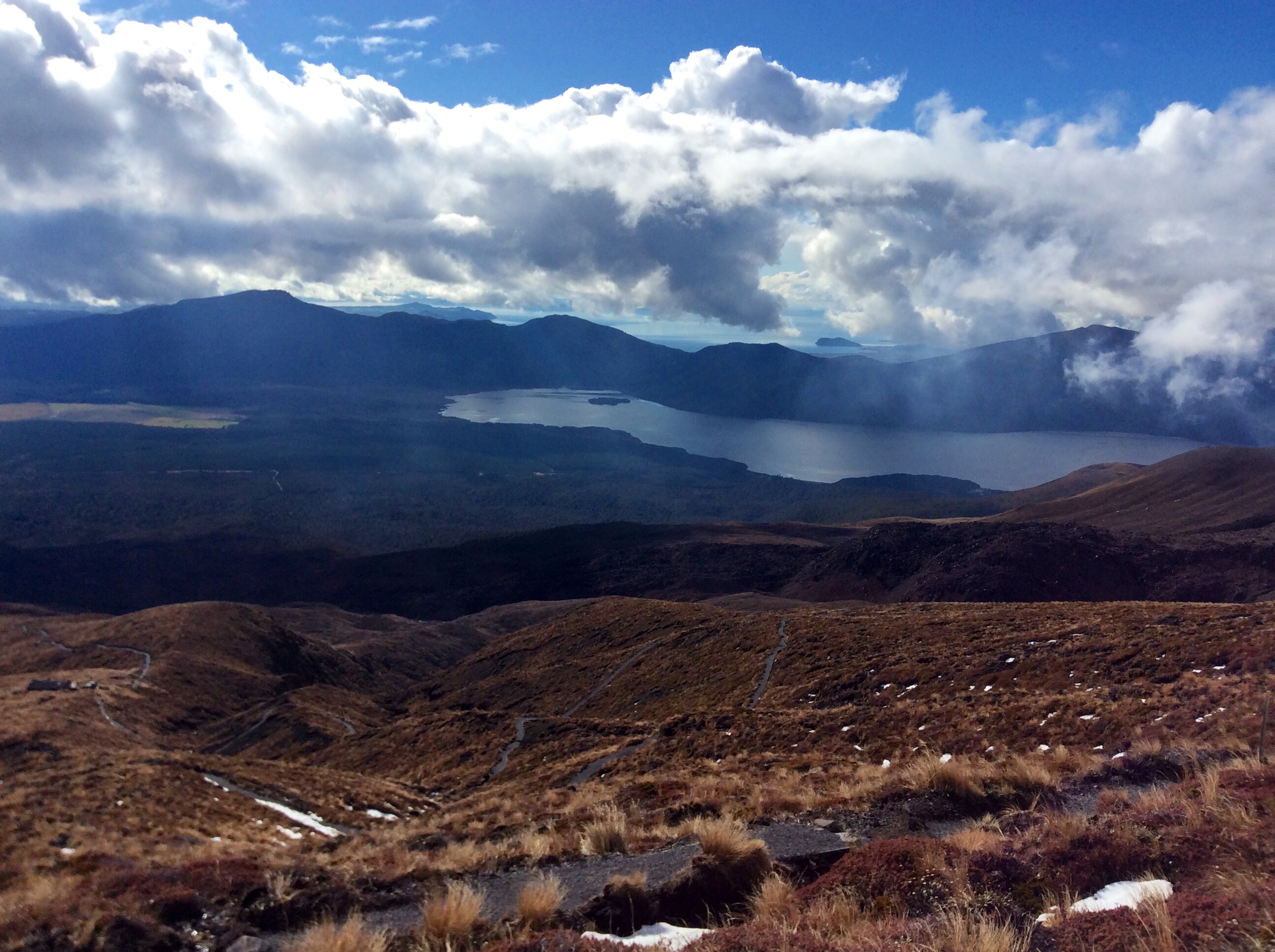 J’ai suffoqué, j’ai tremblé, je me suis même découragée au fur et à mesure que mon souffle s’épuisait. Mais malgré tout, et comme à chaque fois, les paysages sont à la hauteur de l’effort qui m’a été demandé : grandioses. D’un côté, on profite d’une vue imprenable avec des couleurs magistrales. De l’autre, nous admirons le lac Taupo au loin, et l’ensolleillement des plaines. En plein milieu, à la limite de mettre des crampons, nous aurons expérimenté de belles montées enneigées, bravé le blizzard et le froid, mais surtout fait le plein de beaux paysages : pas de regrets, juste des courbatures monumentales à l’arrivée, avec les pieds trempés. Je l’ai fait, cette randonnée renommée !
