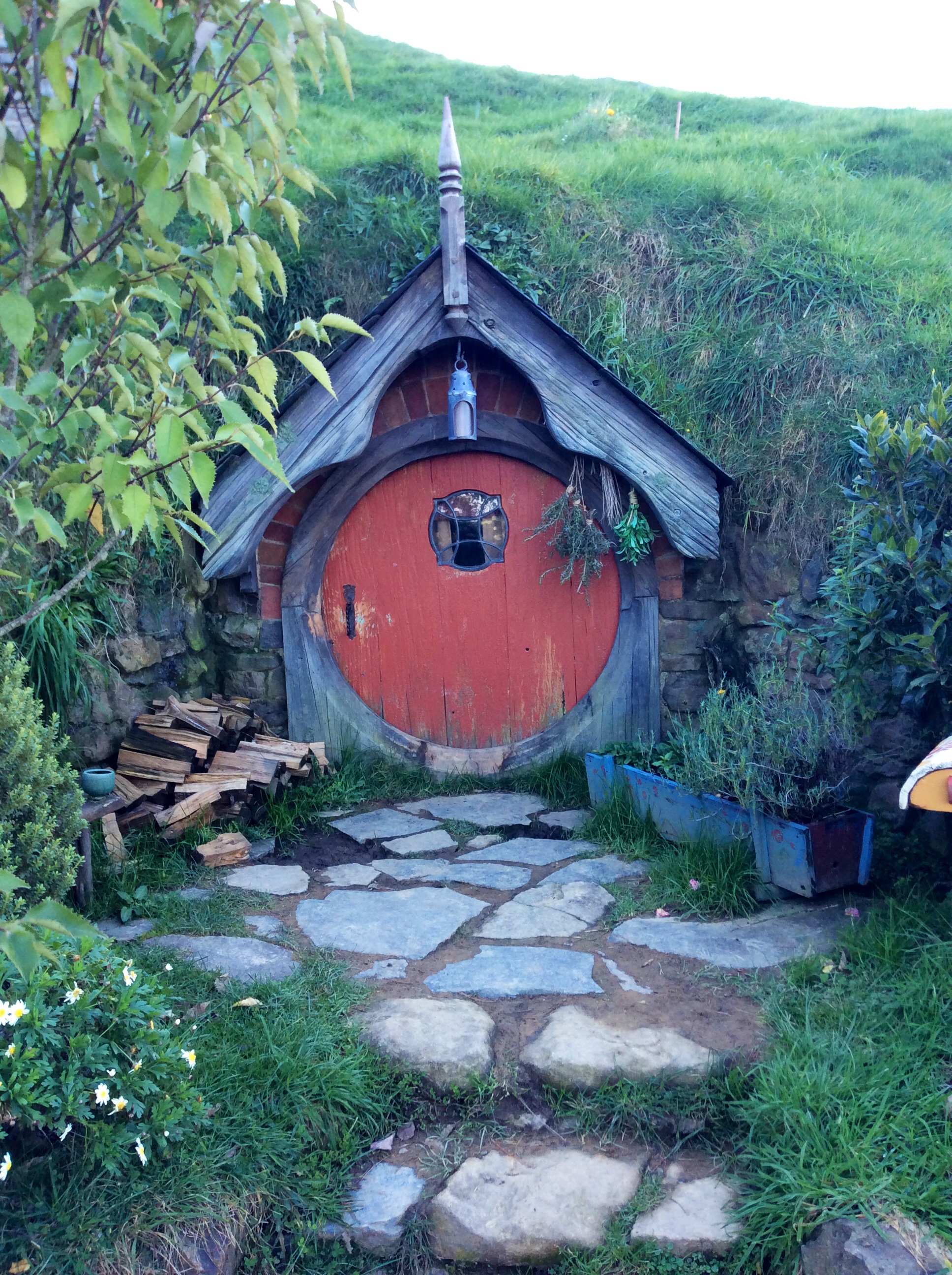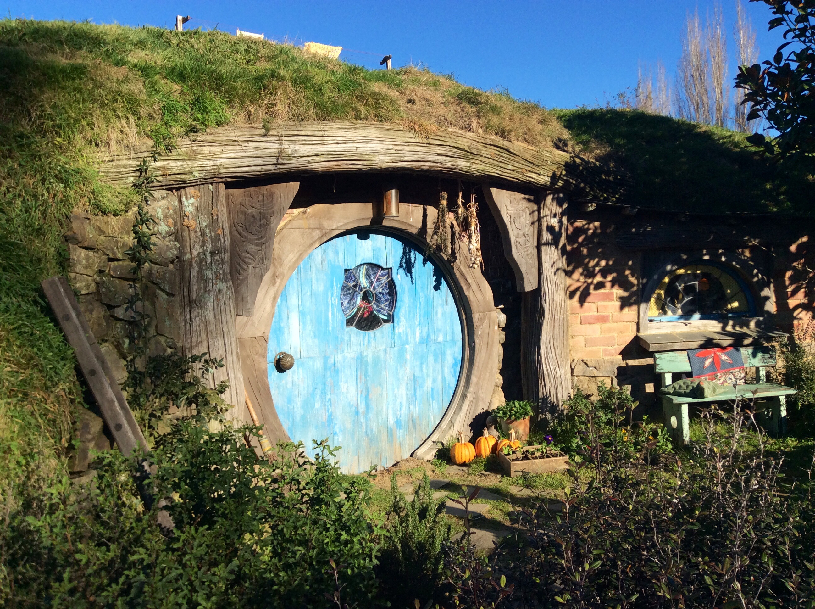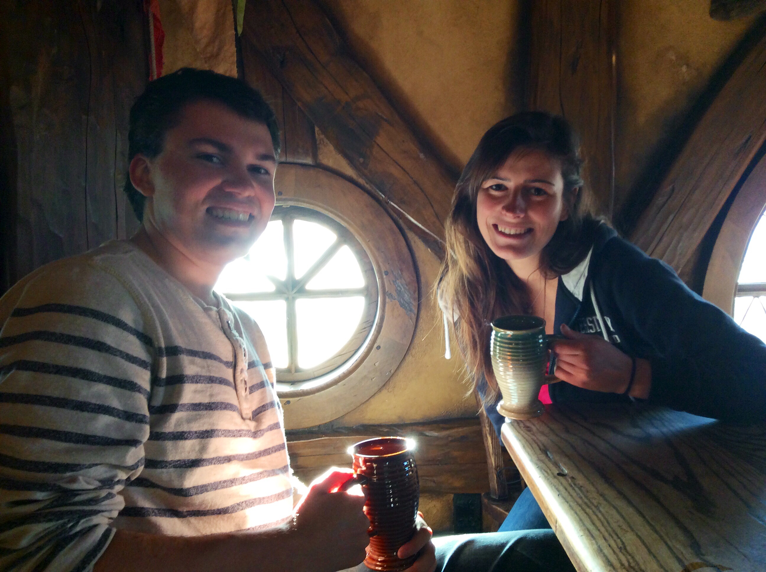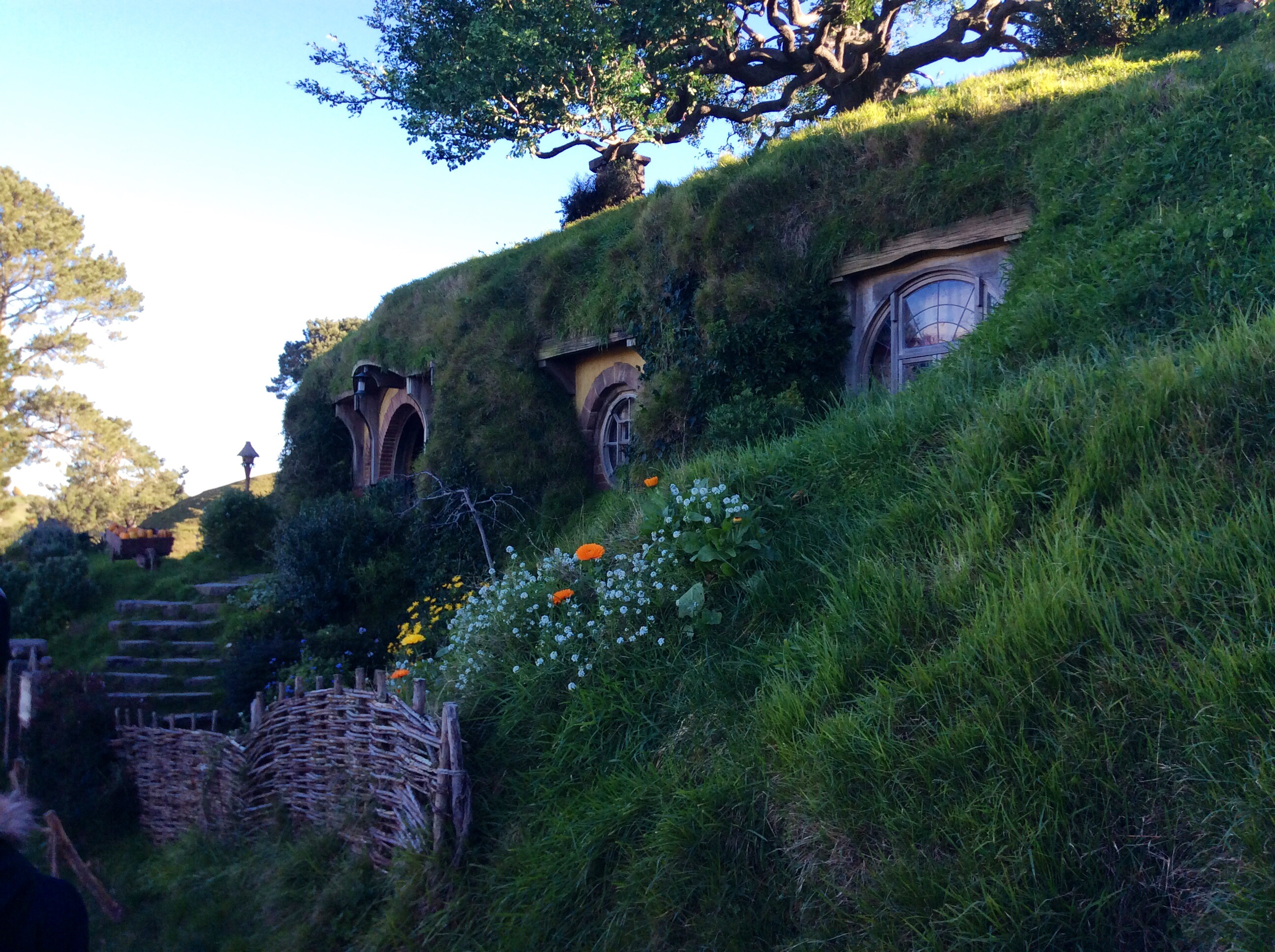 Nous quittons Rotorua et son odeur d’oeuf pourri – qui persiste même dans les rues de la ville, oui oui – pour une immersion fantastique dans un univers médiéval bien connu : le lieu de tournage du Seigneur des Anneaux, et ses trous de Hobbit creusés dans les collines. À bien y repenser, cette visite est un peu un comble pour celle qui n’a jamais vu un seul des films de la trilogie, et pour celui qui est fauché comme pas permis : à $75 l’entrée, nous y avons repensé à deux fois… Oh et puis zut de flûte, on est là qu’une fois, et par la même occasion si je peux en rendre quelques-uns jaloux …