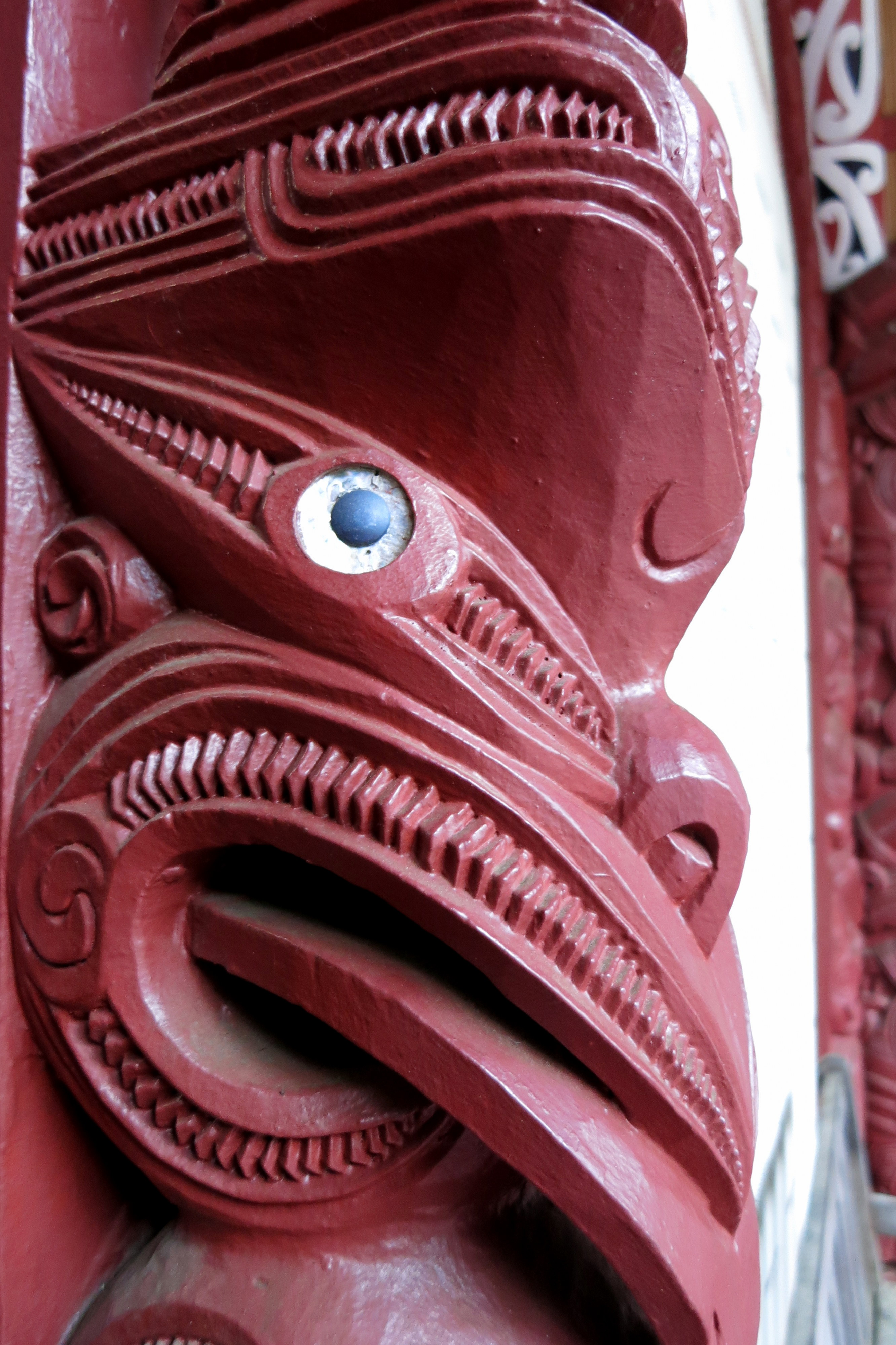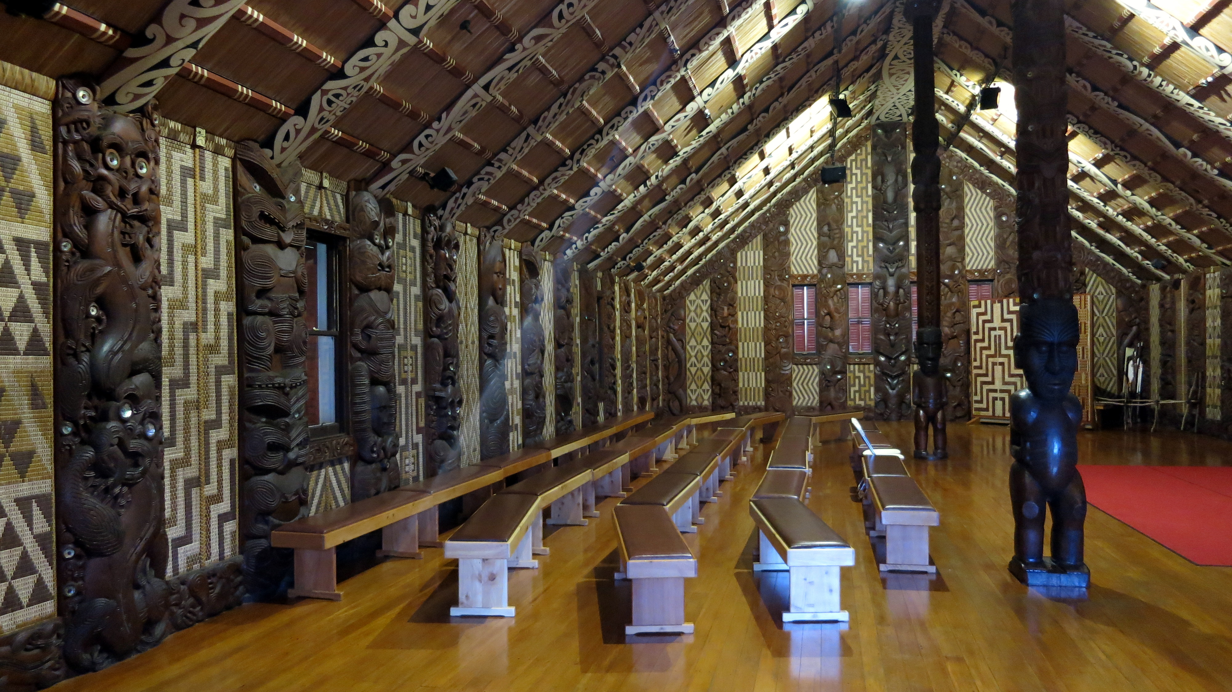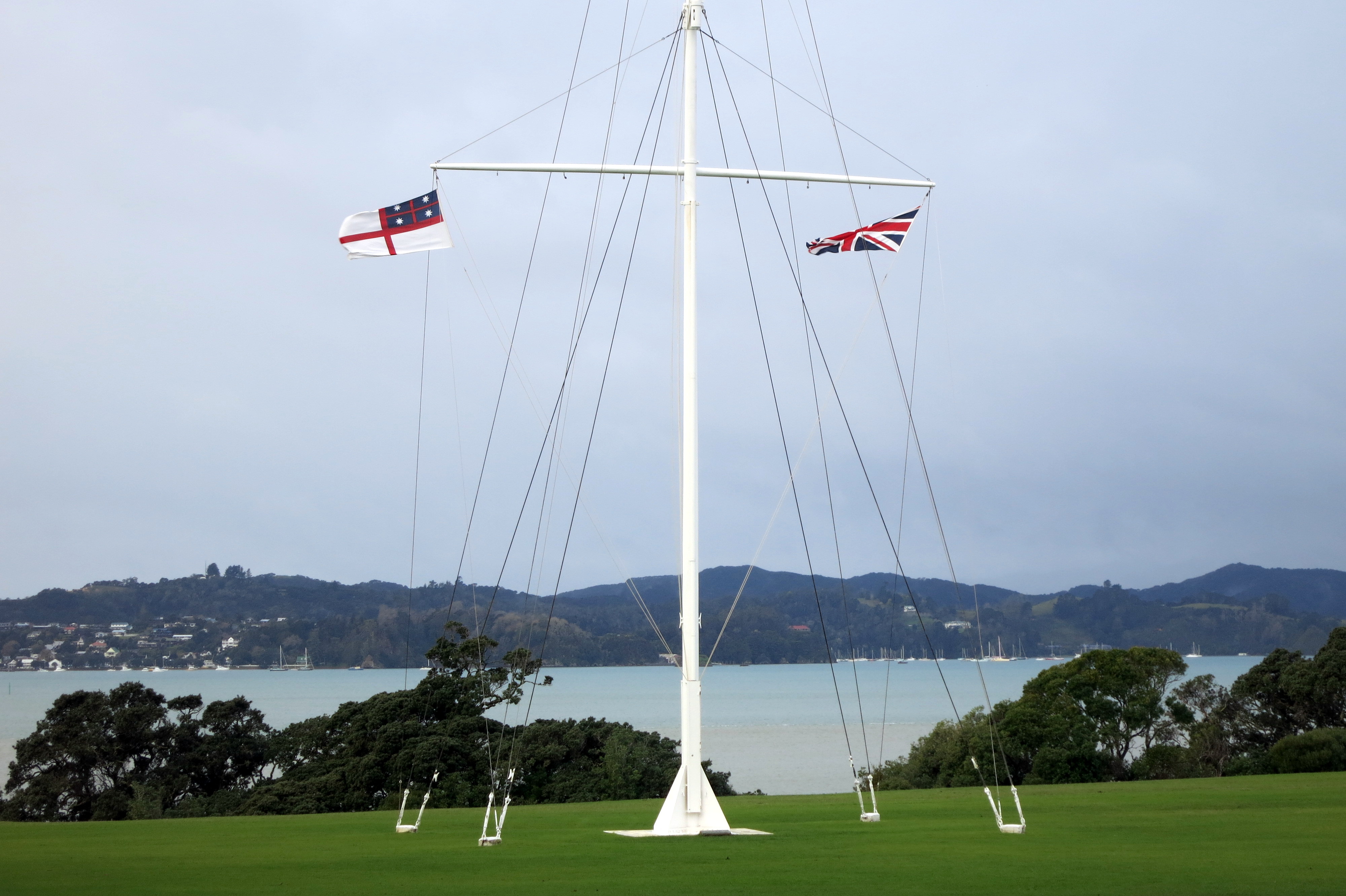 Alors qu’une petite accalmie survient vers 14h, j’en profite pour me rendre à pâtes à Waitangi, 3km plus loin, pour y comprendre la célèbre histoire de son traité. Signé le 6 Février 1840, ce jour est sans doute la date la plus importante de l’histoire de la Nouvelle-Zélande : il déclare officiel le pays et la cohabitation pacifique des Britanniques et tribus Maori. En deux heures j’en aurai sans doute appris plus que nulle part ailleurs : avec le musée pour moi toute seule et un ciel toujours aussi menaçant au dehors, j’ai pris mon temps. Au programme, visite d’une des plus vieilles maisons du pays où Britanniques et chefs Maori se sont accordés le jour J, tandis que d’autres symboles sont passés en revue, notamment le drapeau des Tribus Unies de Nouvelle-Zélande que je trouve particulièrement joli. Petite lueur d’espoir lorsqu’en fin d’après-midi, j’aperçois deux trois rayons de soleil et profite d’un peu plus de luminosité. Le temps est un peu moins hostile et plus appréciable.