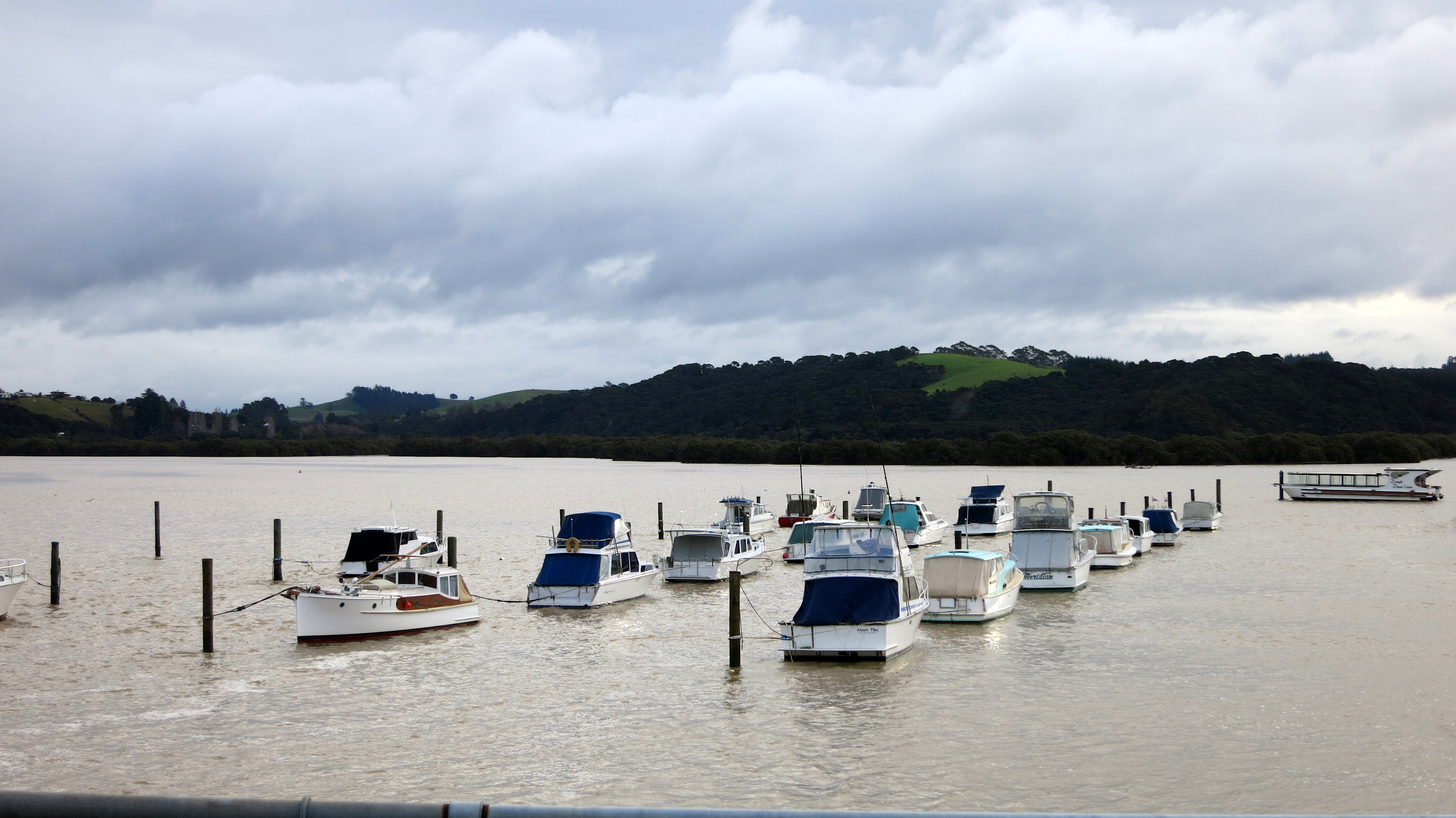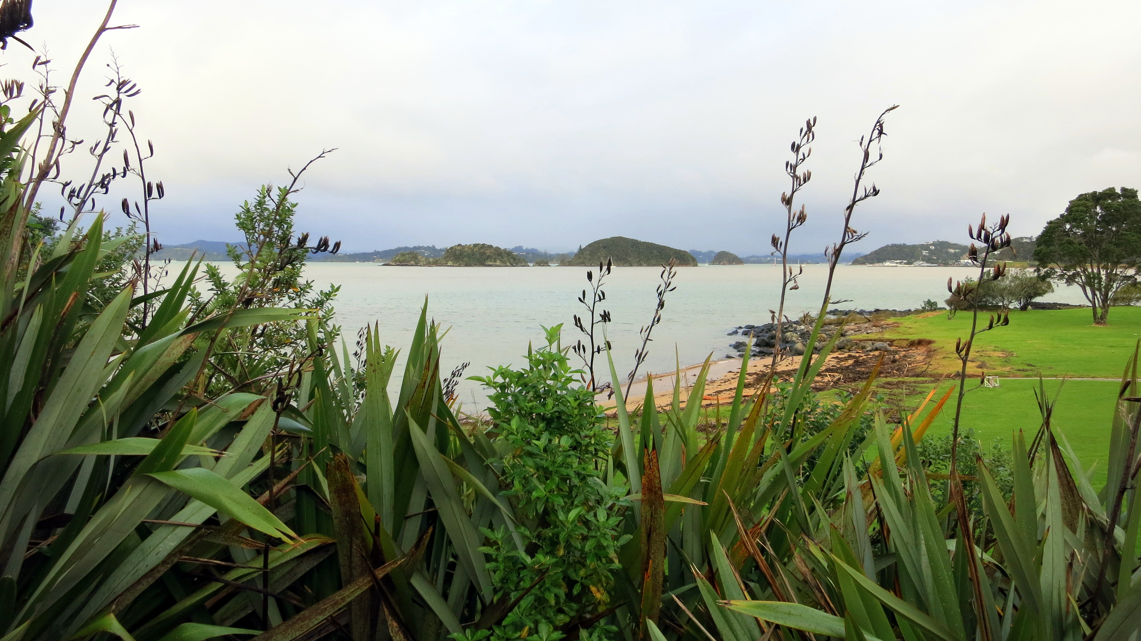 Quel accueil lorsqu’à 11h30 je débarque sous une pluie battante ! Une averse qui durera plus de deux heures et m’obligera à traîner dans toutes les boutiques possibles et inimaginables, entre souvenirs et vêtements, alors que la petite ville de Paihia qui borde la baie n’est pas plus grande qu’un petit patelin français. Un dimanche en plus, tout ou presque est fermé ou désert. Visibilité zéro pointé, j’ai maintenant 6h à tuer. D’ordinaire, il est possible de faire des croisières pour admirer dauphins et baleines, tout autant que le ferry pour la petite île qui fait face à Paihia est recommandé. Pas la peine de gaspiller de l’argent ni d’insister avec un temps pareil.