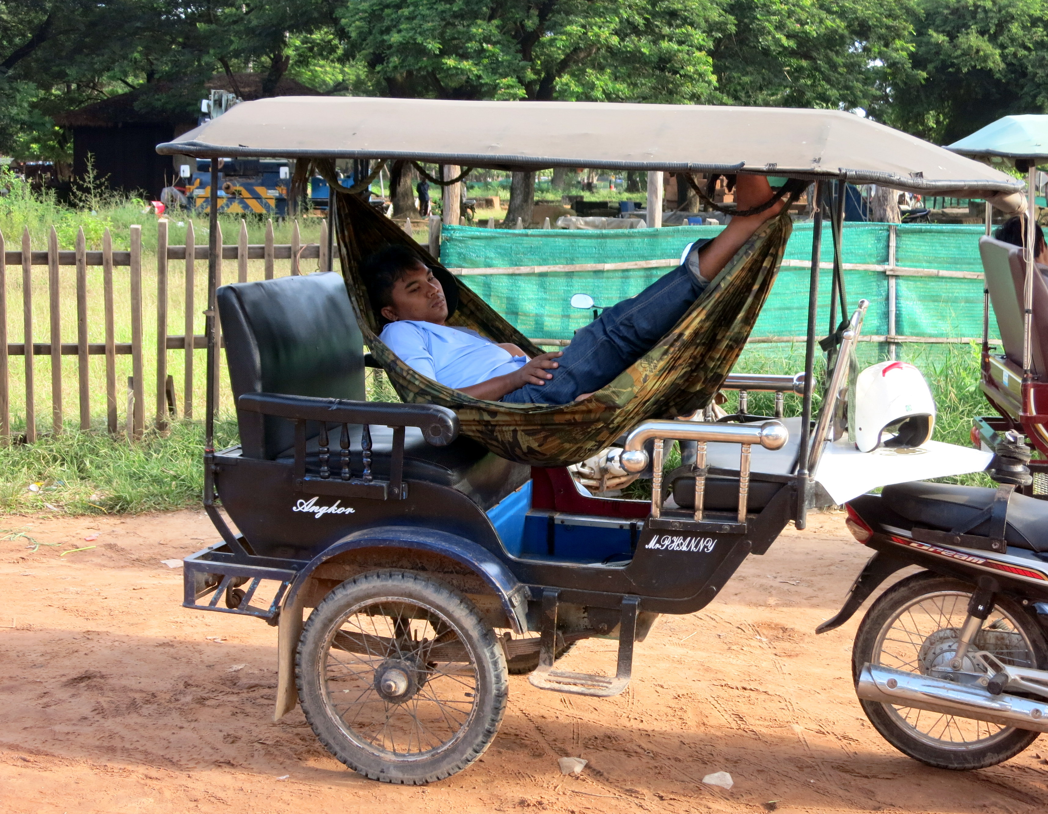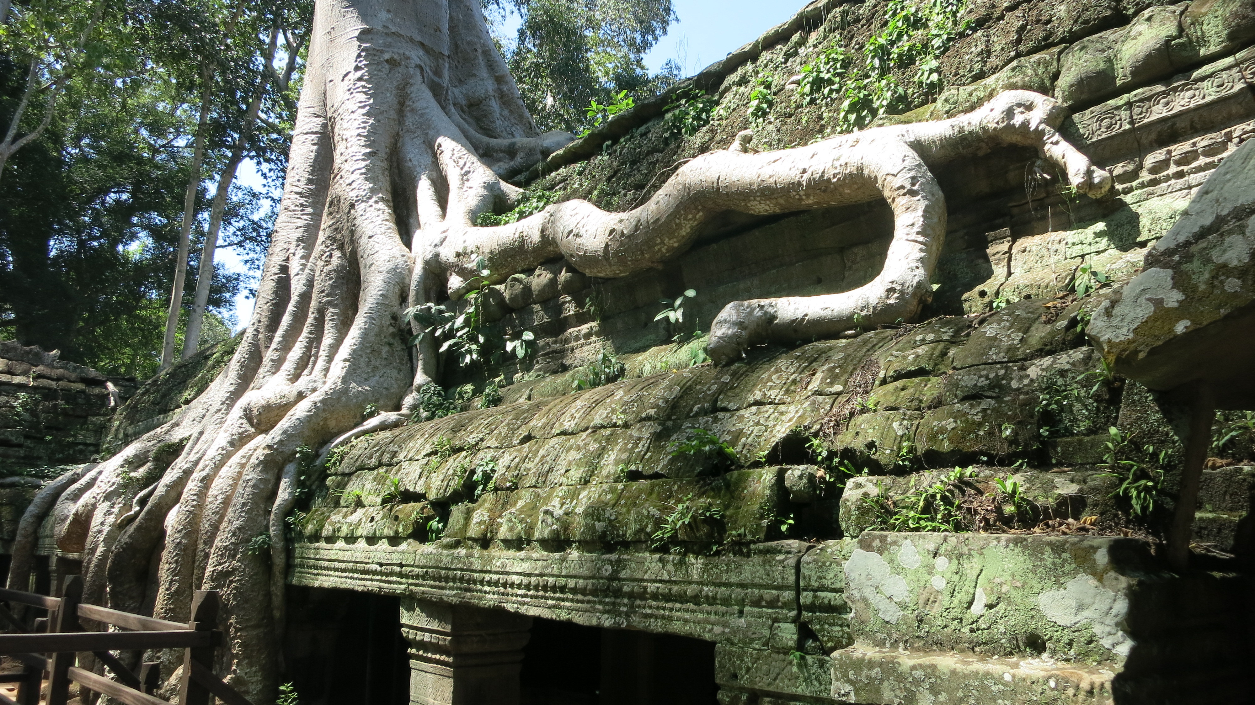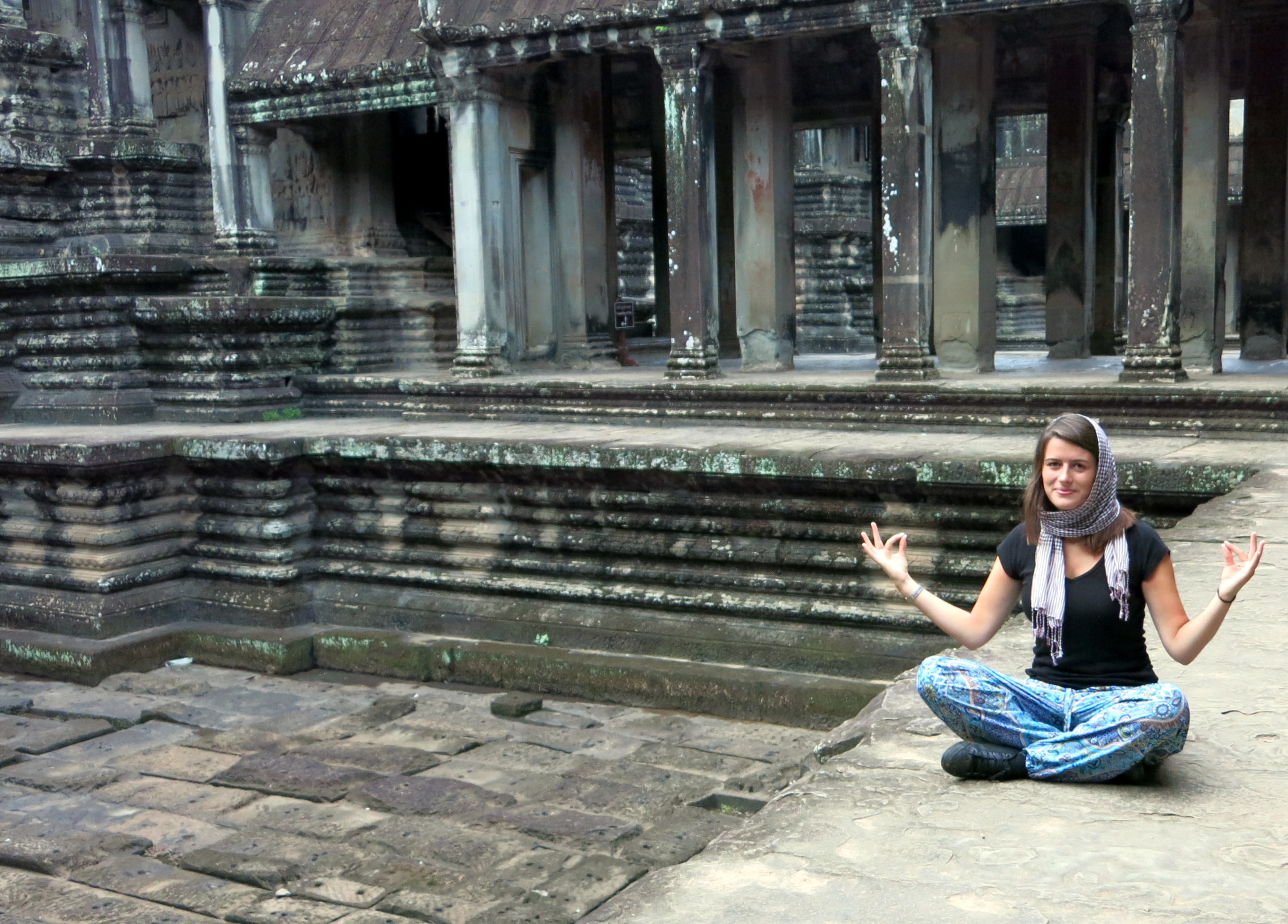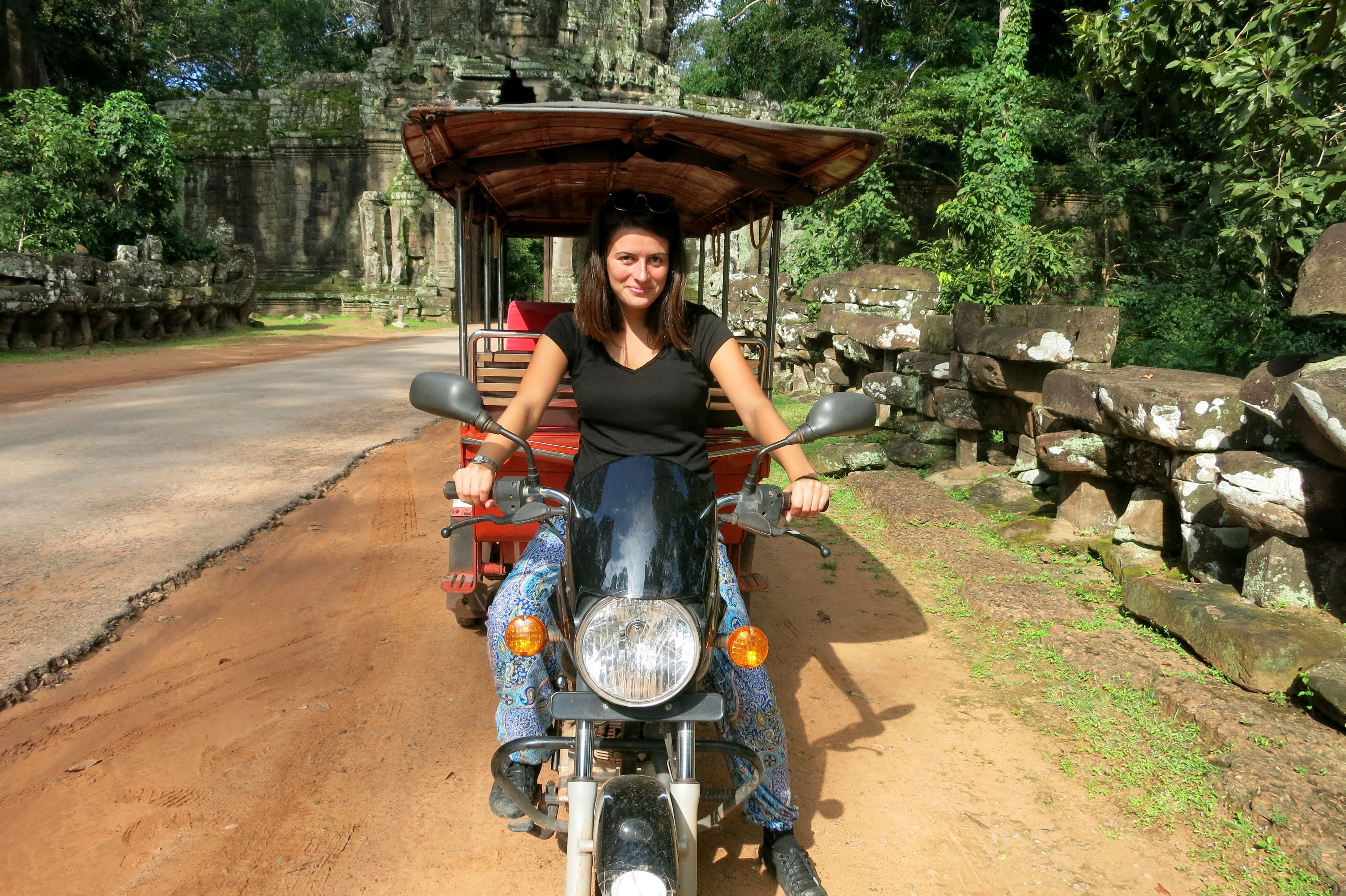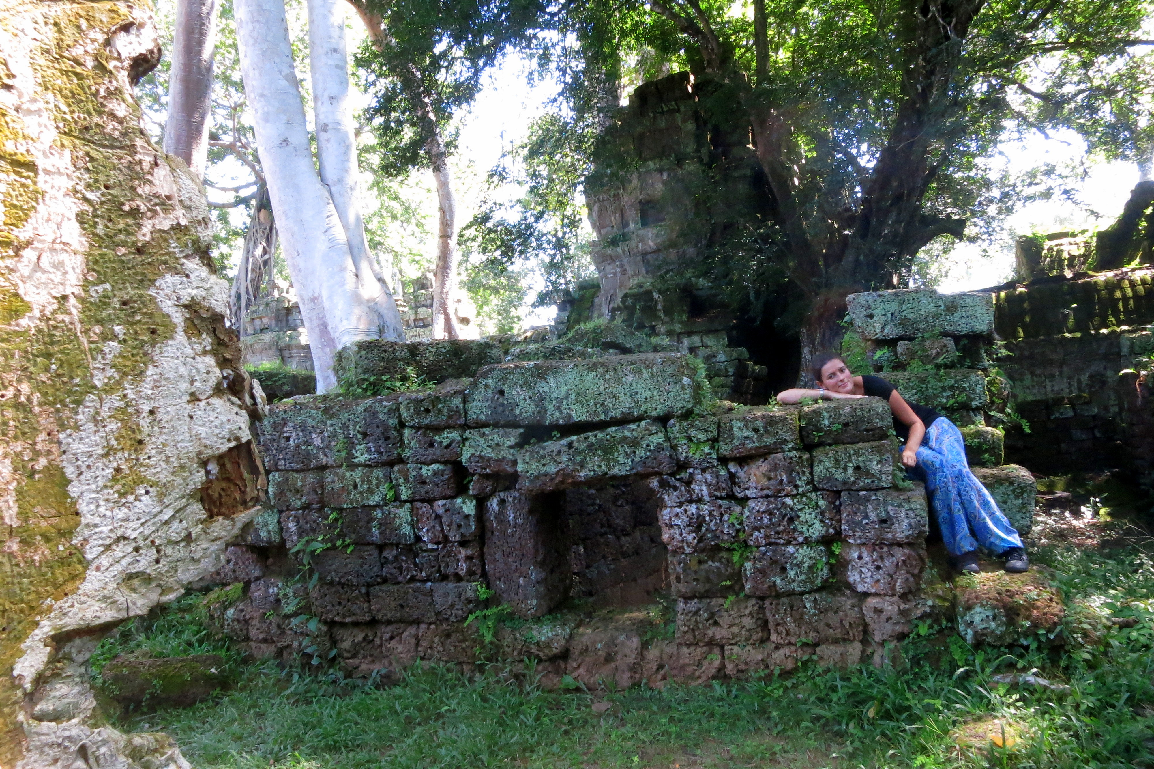 Comme d’habitude, pas facile de décrire les ressentis : essayez d’imaginer les chants des oiseaux, les odeurs de coco, la chaleur sur la peau. Bref, l’exotisme du pays, sans les moustiques !!! À ma grande surprise, et malgré la saison des pluies, je ne me suis pas encore fait dévorer : chose rare. La jungle gagne une place de plus dans mon cœur, au détriment de la plage.En même temps que j’escalade des ruines, j’écoute attentivement mon compagnon de route sur l’histoire du pays, et ce qu’il a vécu avec sa famille. J’en apprends bien plus sur le génocide khmer que sur toutes mes années d’études scolaires ! 90% des gens ont connu des pertes de proches ou des séparations pendant les années rouges, et pourtant, ils sourient en abordant le sujet. Mon super guide aussi, tout simplement parce qu’il a conscience de sa nouvelle liberté. Je fais pale figure à côté, moi et ma vie trépidante : bien trop confortable pour imaginer ne serait ce qu’une once de ce qu’il a traversé .Grace à son enthousiasme légendaire et à sa foi, il est aujourd’hui le bon père de famille qui gagne sa vie grace aux touristes près à payer le triple de son salaire à la journée ! Bon, entre temps, j’aurai appris que mon guide chéri s’est un peu fait enliser dans une secte puisqu’il n’a cessé de me vanter les bienfaits des …témoins de Jéhovah. Mmmh oui, j’y penserai un jour ….peut être..!