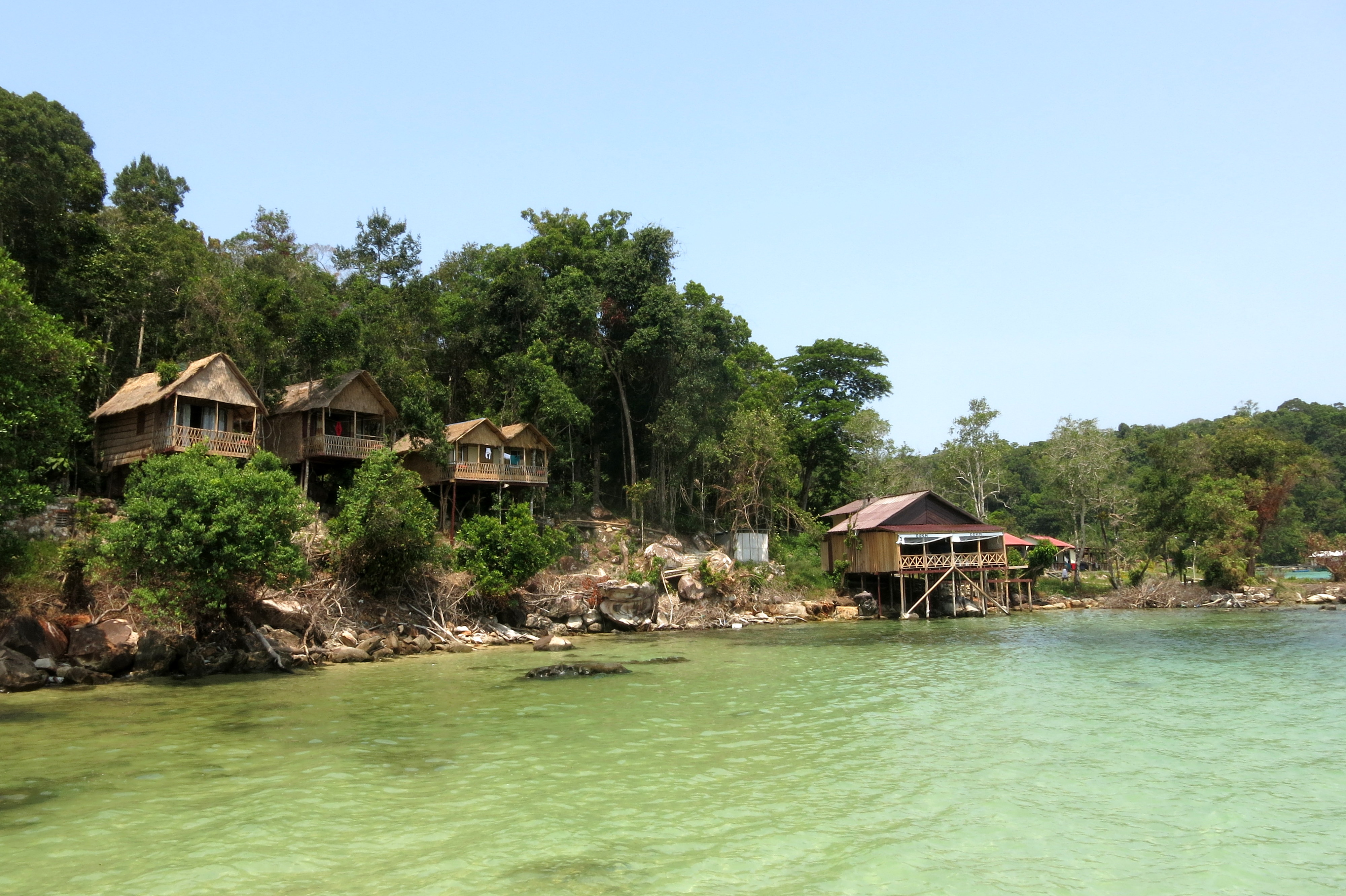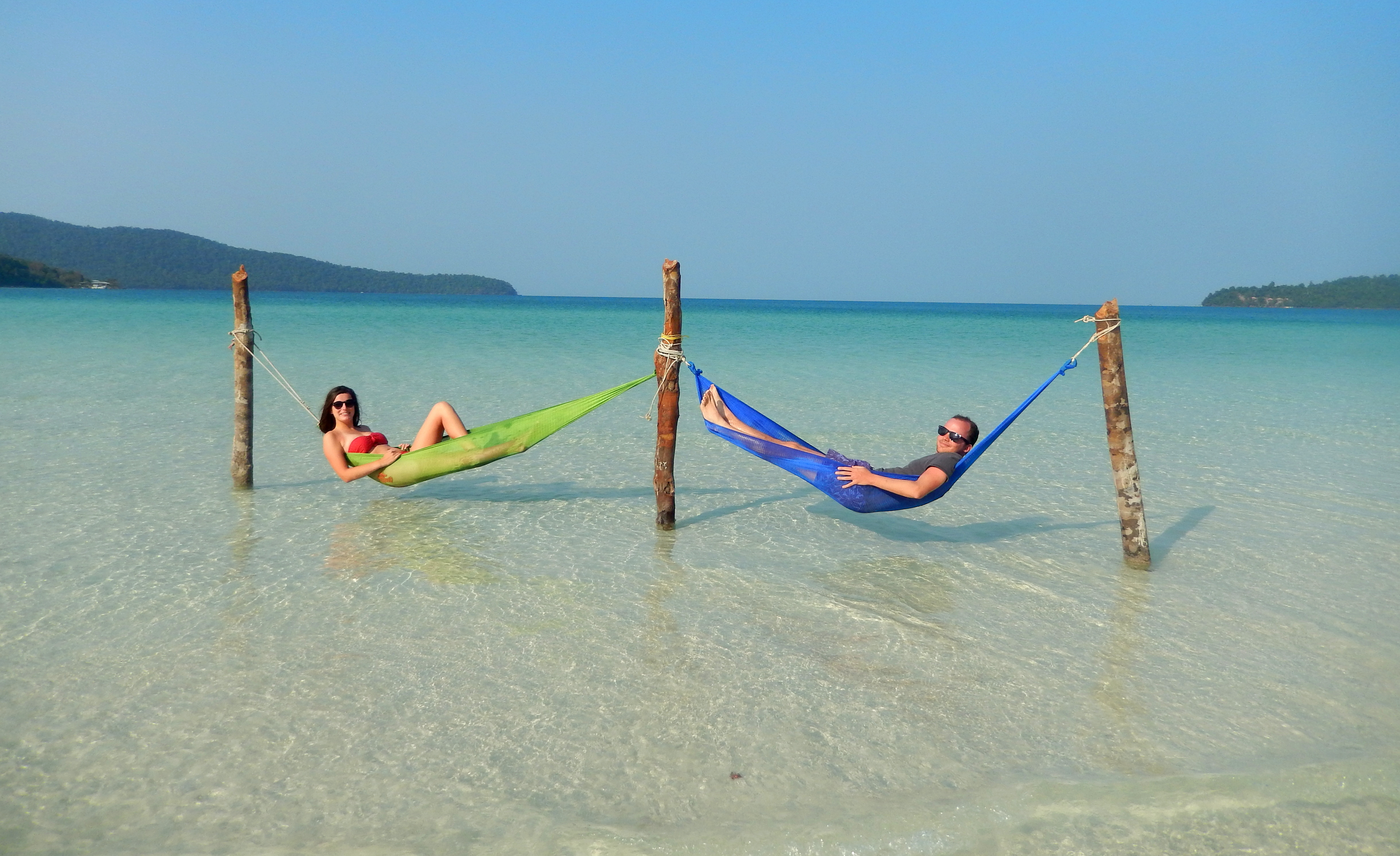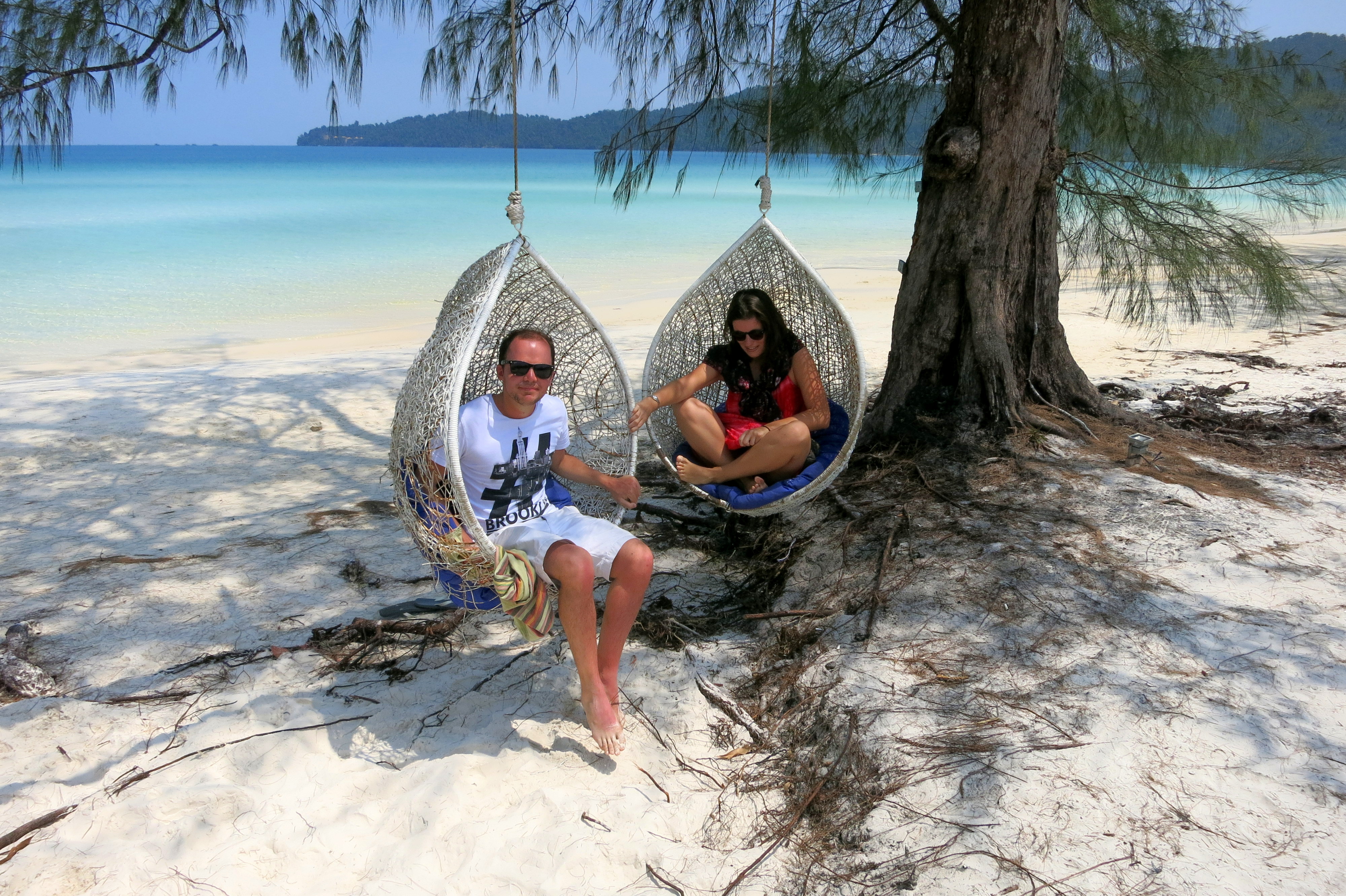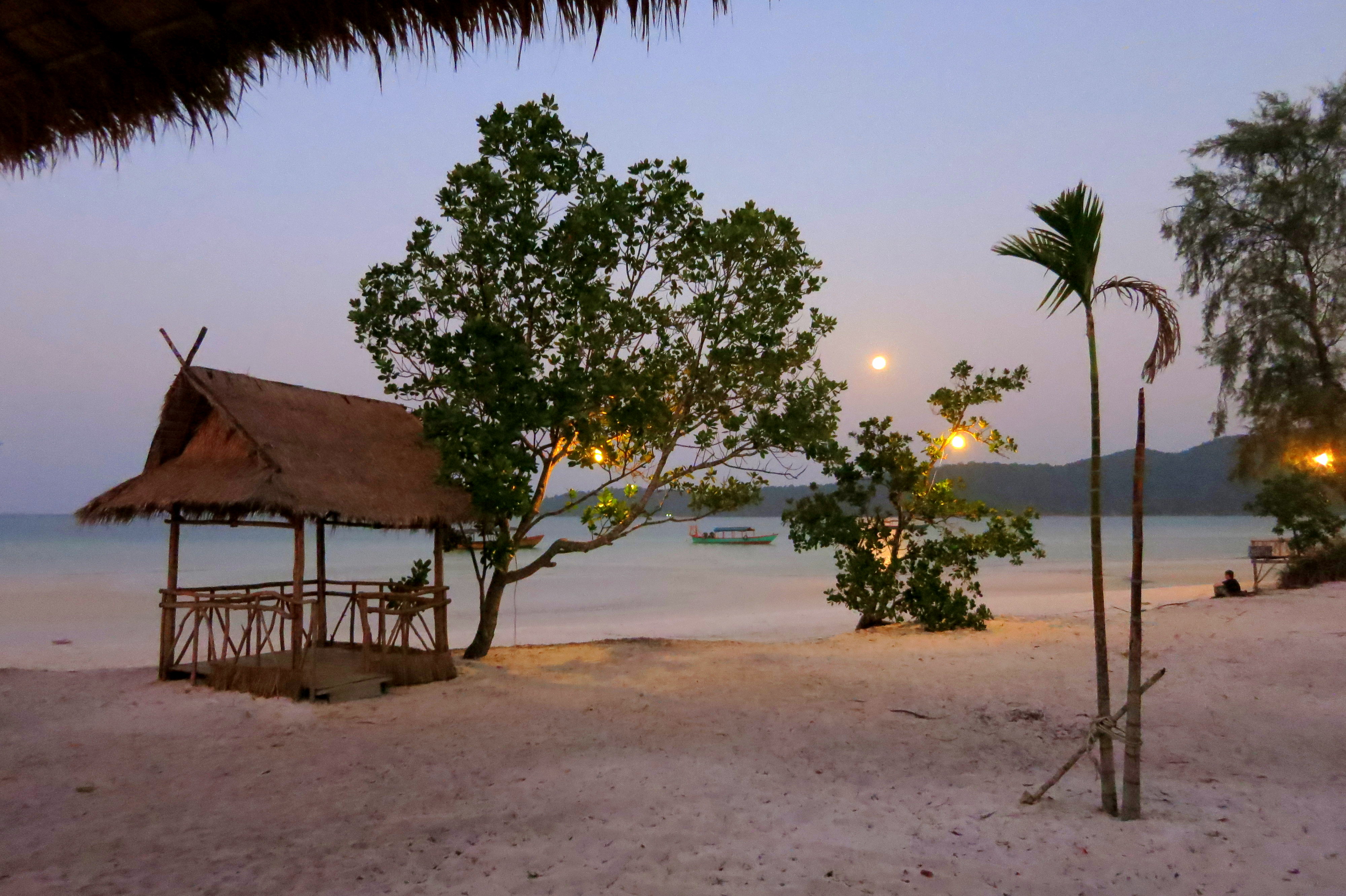 Vœu exaucé à notre arrivée, et puis, place à l’émerveillement. 10cm d’eau turquoise sur plus de 100 mètres, et 5km de plage pour décider de notre spot préféré. Je crois pouvoir le trouver ! La haute saison bat son plein, mais il n’y a pas foule. C’est ça le charme du Cambodge : encore loin de la saturation des plages de Thaïlande. Et surtout, du silence ! Les hippies se sont enfouis dans la jungle assez rapidement pour nous laisser sereins, à siroter notre jus de fruit frais à l’ombre par 40 degrés. Que l’on soit clairs : on aura cramés en une demie-journée. Résultat : tous à couverts, les deux jours d’après ! Programme lecture, glande, dodo; lecture, glande, photos; lecture, glande, grands débats autour de mojitos. Et surtout, ne rien faire. 3 jours, c’est ce qu’il nous fallait pour prendre le temps de décrocher. Encore plus facile quand il n’y a pas d’électricité la journée !.