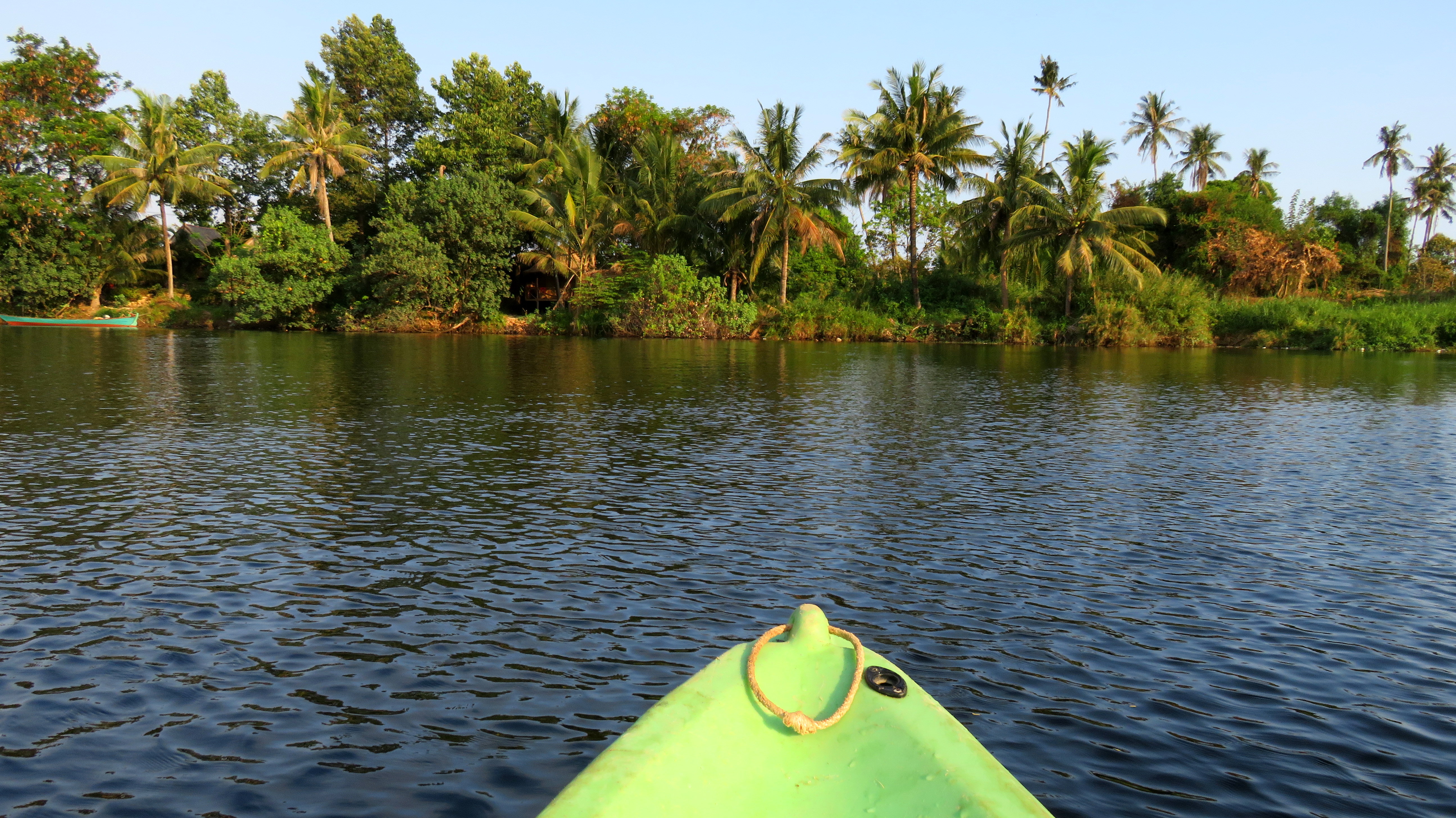 Entre Kep et Kampot, bien souvent les cœurs balancent. Le mien ira pour Kampot, sans doute pour l’environnement naturel et apaisant de sa rivière, avec une zénitude accrue lorsqu’on y loge au bord. Bungalows à l’appui et activités nautiques en tout genre dans un cadre verdoyant, ça me rappelle curieusement la maison de mes cousins au bord du Lot où nous passions nos vacances d’été, près d’Agen. Stéphane est comme un poisson dans l’eau et m’initie une deuxième fois au kayak, que je rayerai définitivement de ma liste de sports favoris : j’ai une ampoule, j’ai mal aux bras, j’ai mal au dos, et il fait chaud ! Je préfère les bouées qui me permettent de flâner et de suivre le cours de la rivière… Qu’il fait bon ne rien faire …!