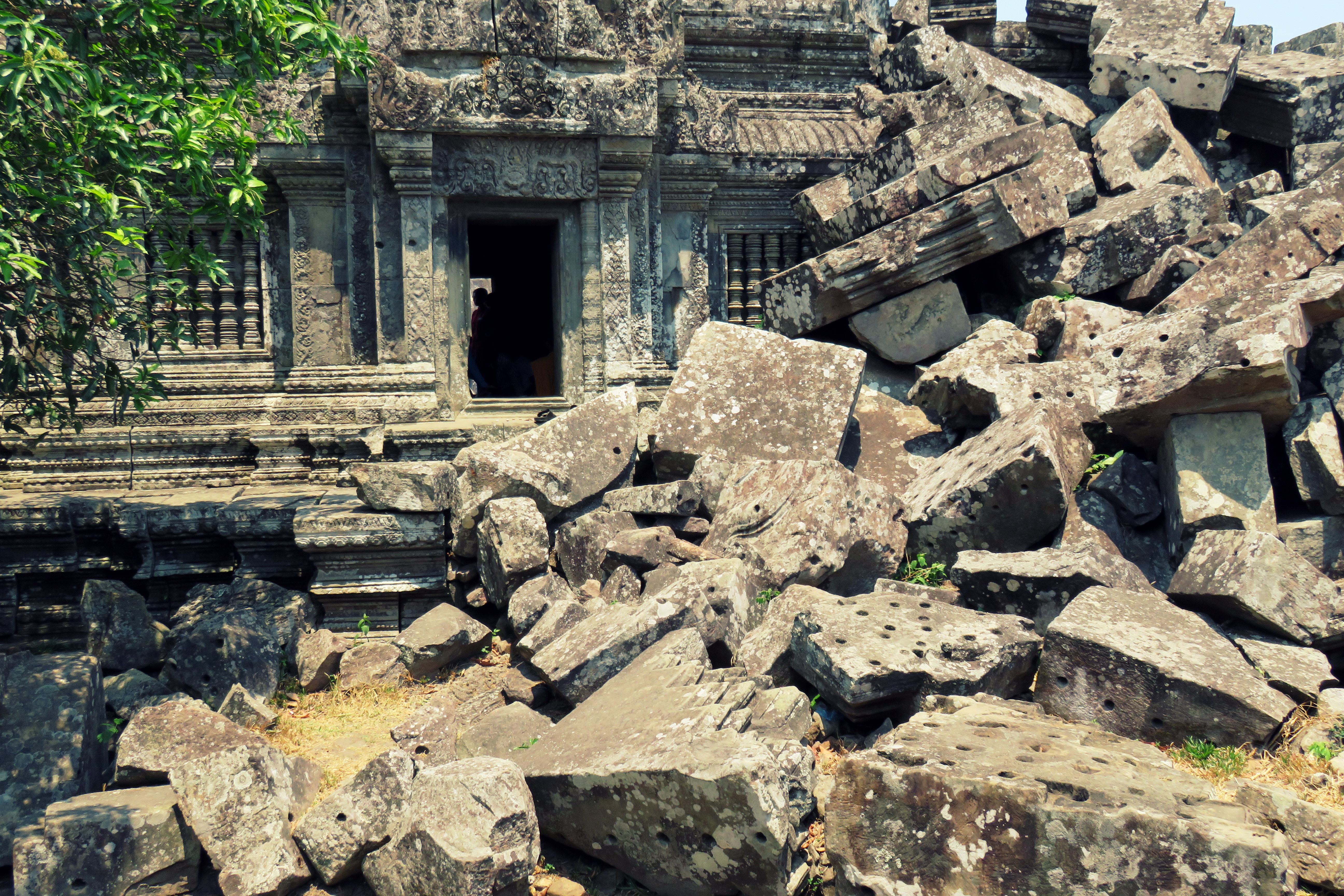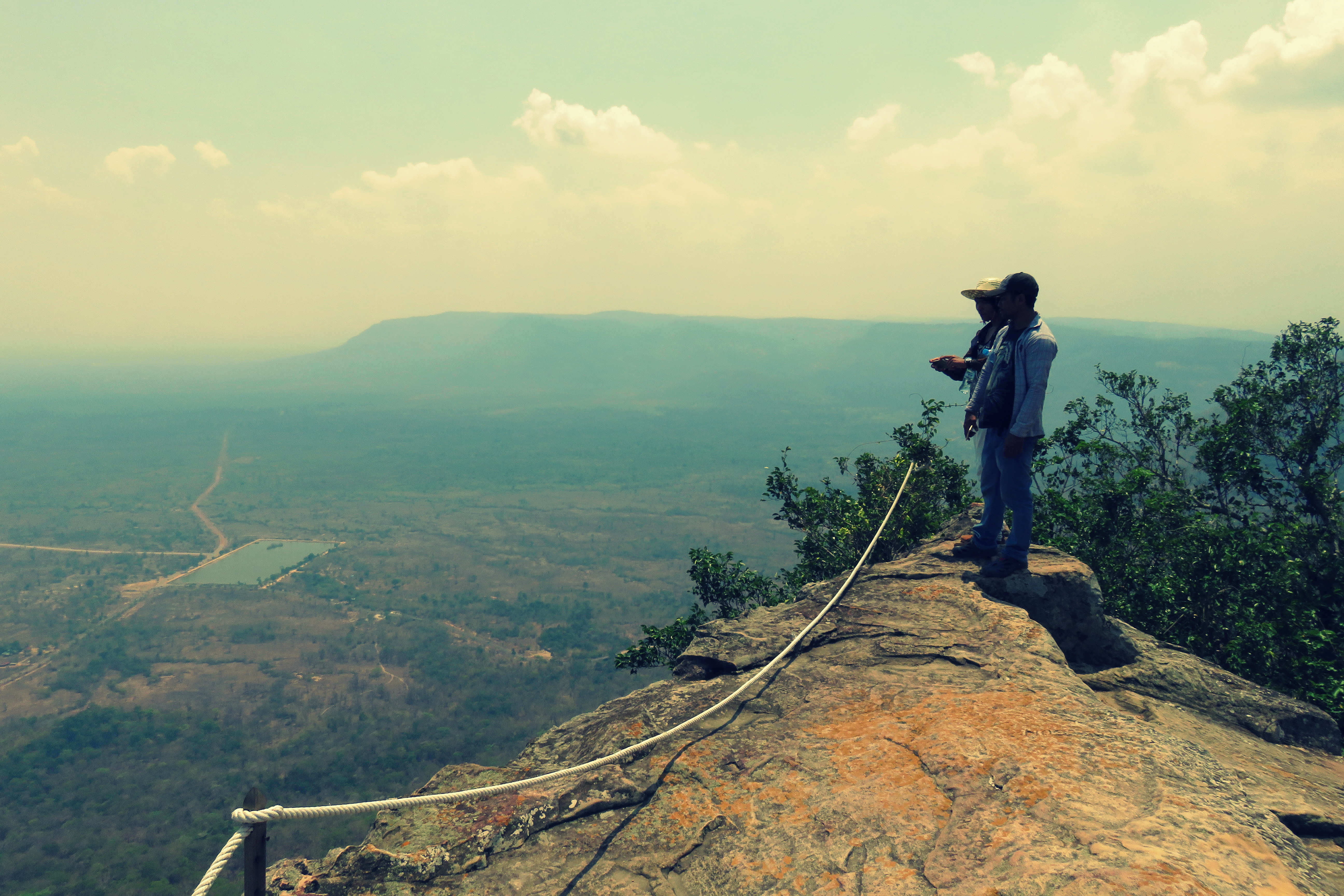La montée est impressionnante. Après plus de 3h de route depuis Siem Reap et une bonne grosse fatigue contante qui nous suivra toute la journée, Stéphane et moi nous accrochons durs comme fer aux sièges du 4×4 lorsque celui-ci entame une pente avec un angle d’attaque à mon humble avis pas très conforme aux normes. Peut être 40/45%, nous obligeant à adopter les 4 roues mobiles et à ne surtout pas regarder en arrière. Au passage, nous croisons des familles vivant ici, ce qui nous paraît clairement impossible. Mais si. Un besoin d’eau ? À toi de redescendre et de te rendre au village le plus proche, que je cherche encore aujourd’hui. Meme depuis le sommet, il m’est invisible. Sous une chaleur de plomb, nous visitons un site aux allures de vestiges abandonnés : au milieu des terres asséchées, les ruines de Preah Vihear règnent définitivement sur les plaines alentours.