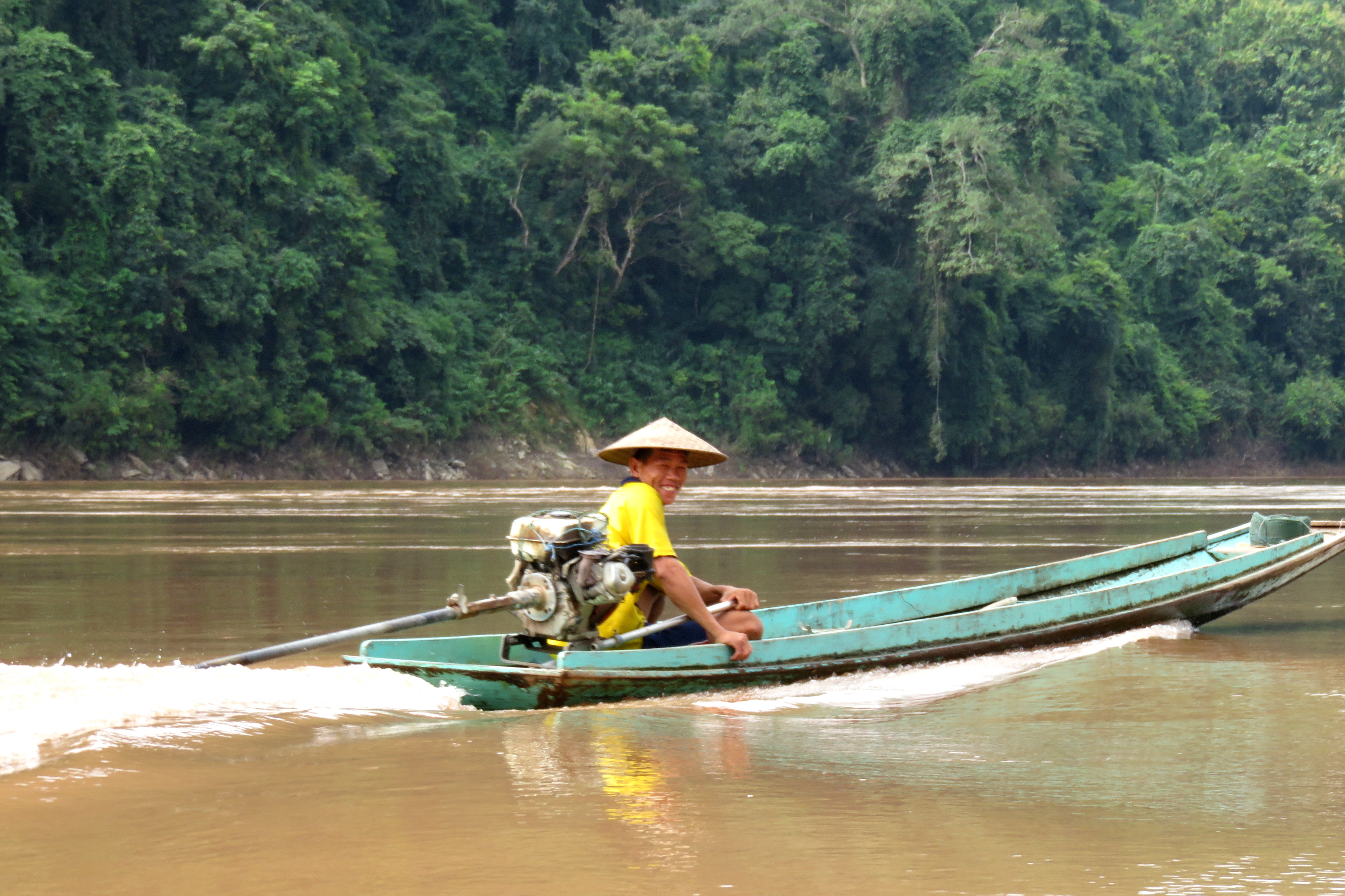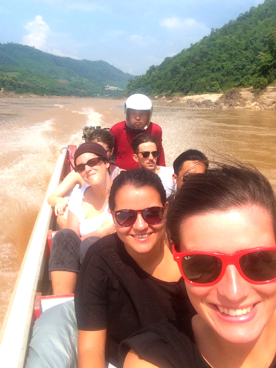 Il est vrai que rallier Luang Prabang au Nord en 6 heures diffère clairement des traditionnels slow boats qui s’y rendent en deux jours (et garantissent un ennui maximal mais chut, on ne le dira pas – une façon supplémentaire d’auto-persuasion du bien-fondé de notre option). À quoi nous nous attendions, je ne sais pas, mais certainement pas à cette …pirogue lilliputienne où planches de bois faisaient office de dossier et casques de MOTO nous étaient donnés…juste au cas où. Mon dieu, nous allons couler.