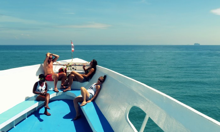 Au programme pas grand-chose : coconut, coups de soleil, cocktails, baignades et selfies asiatiques pour bien faire rager les autres copains restés à la maison. Ah si, nous bénéficierons du meilleur massage qui soit. Il n’y a pas à dire, les massages Thai, c’est un niveau au-dessus. Voilà donc 5 flemmards allongés tous guillerets, caquetant, avec à perte de vue l’océan et …seulement 5 minutes pour que les doigts de fée des masseuses nous transforment en loques ronfleurs. Plus un bruit, une sieste bien nécessaire avant ce qui s’annonce comme une folle nuit. Essayées, les soirées plages-boite. Tentées, les parts de pizza géantes a une heure un peu matinale. Oubliées, certaines discussions houleuses. Compliqué, le lendemain et le retour en bateau.