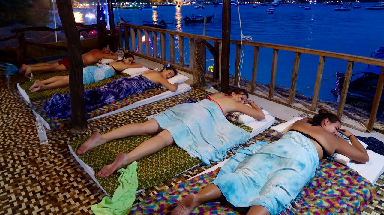 Au programme pas grand-chose : coconut, coups de soleil, cocktails, baignades et selfies asiatiques pour bien faire rager les autres copains restés à la maison. Ah si, nous bénéficierons du meilleur massage qui soit. Il n’y a pas à dire, les massages Thai, c’est un niveau au-dessus. Voilà donc 5 flemmards allongés tous guillerets, caquetant, avec à perte de vue l’océan et …seulement 5 minutes pour que les doigts de fée des masseuses nous transforment en loques ronfleurs. Plus un bruit, une sieste bien nécessaire avant ce qui s’annonce comme une folle nuit. Essayées, les soirées plages-boite. Tentées, les parts de pizza géantes a une heure un peu matinale. Oubliées, certaines discussions houleuses. Compliqué, le lendemain et le retour en bateau.